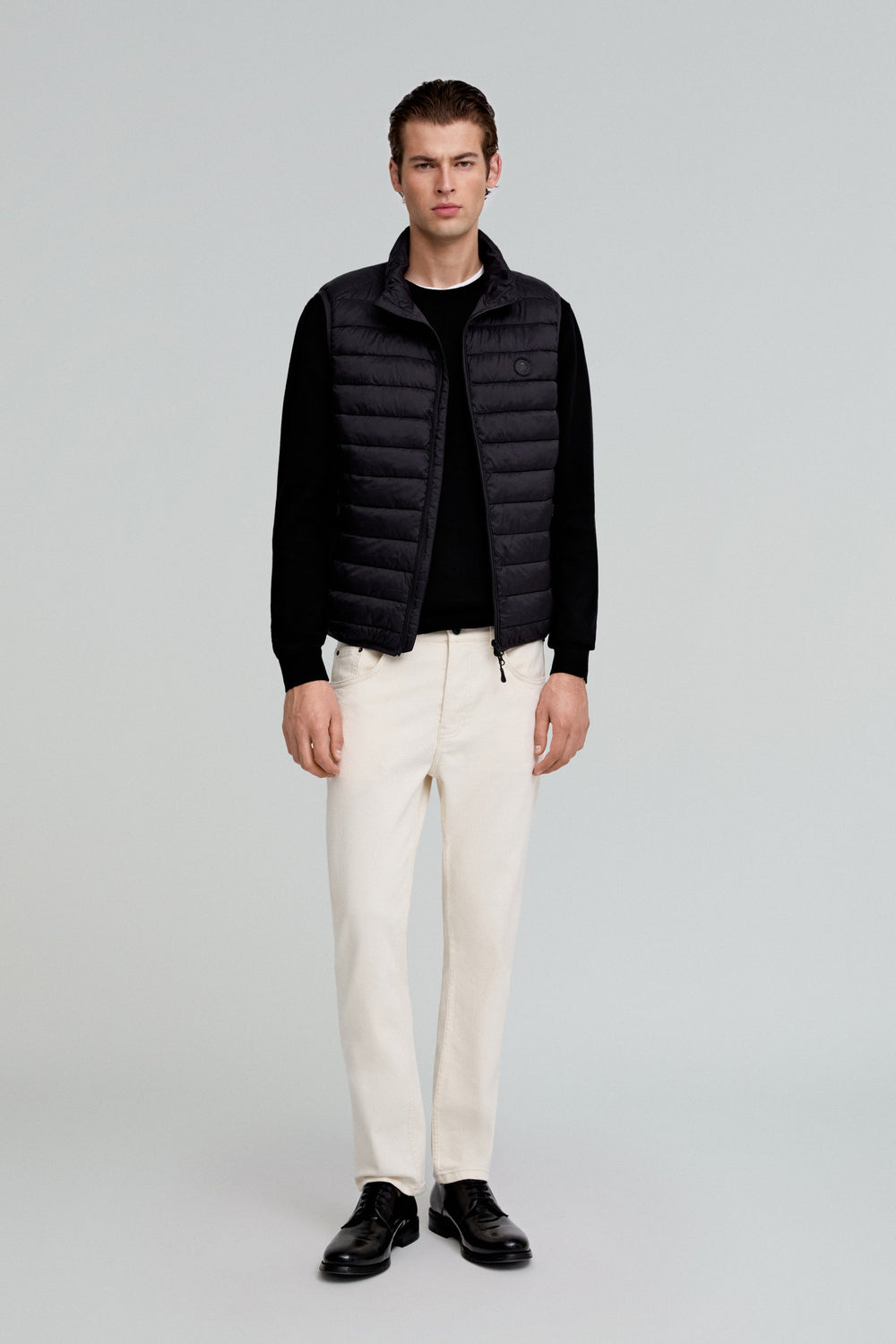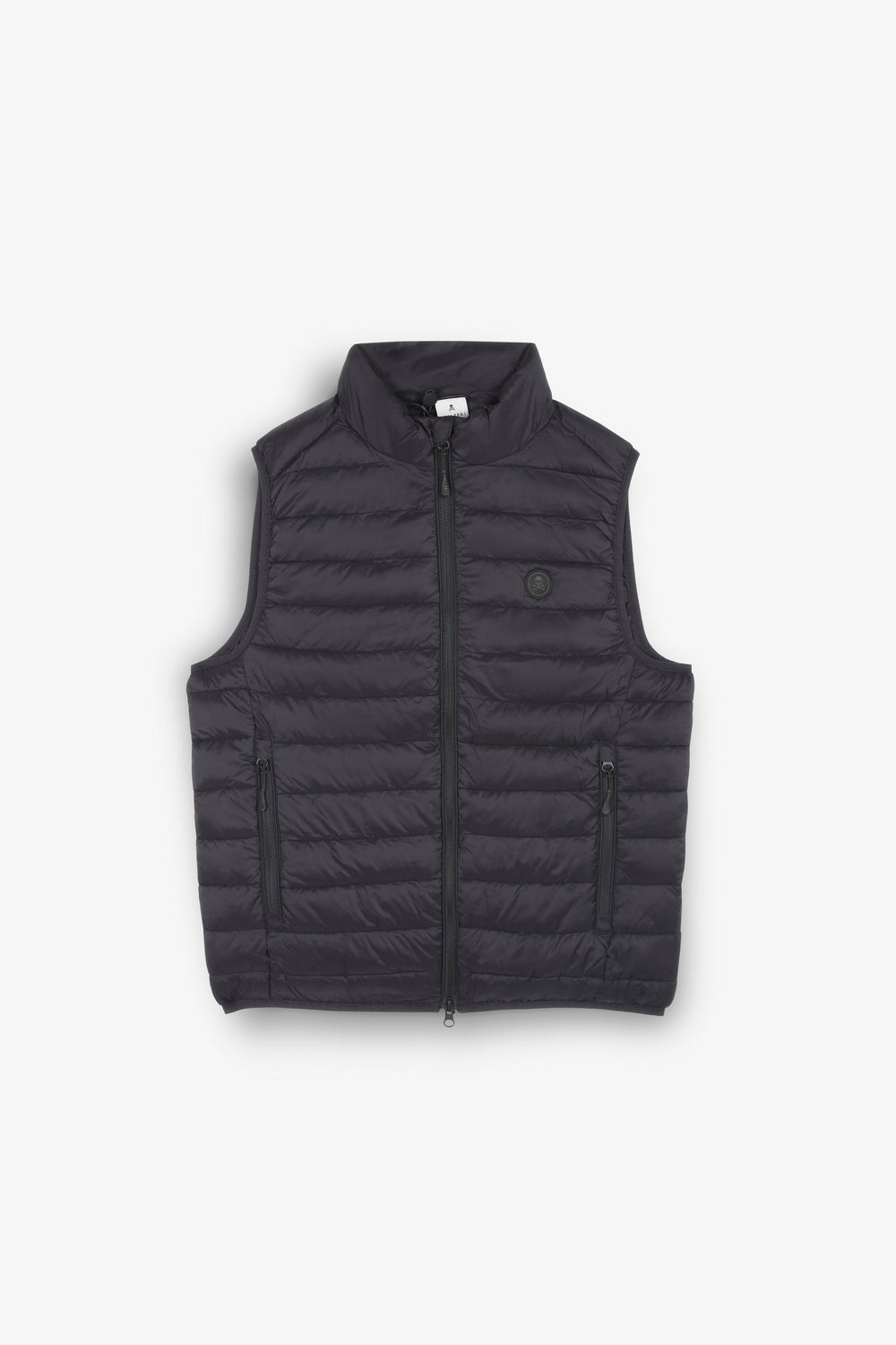 Light puffer gilet. Crafted from nylon and recycled polyester fabric. Slim Fit. High collar. Two-way zip fastening. Zip pockets and an inner pocket. Rubber patch detail on the chest.