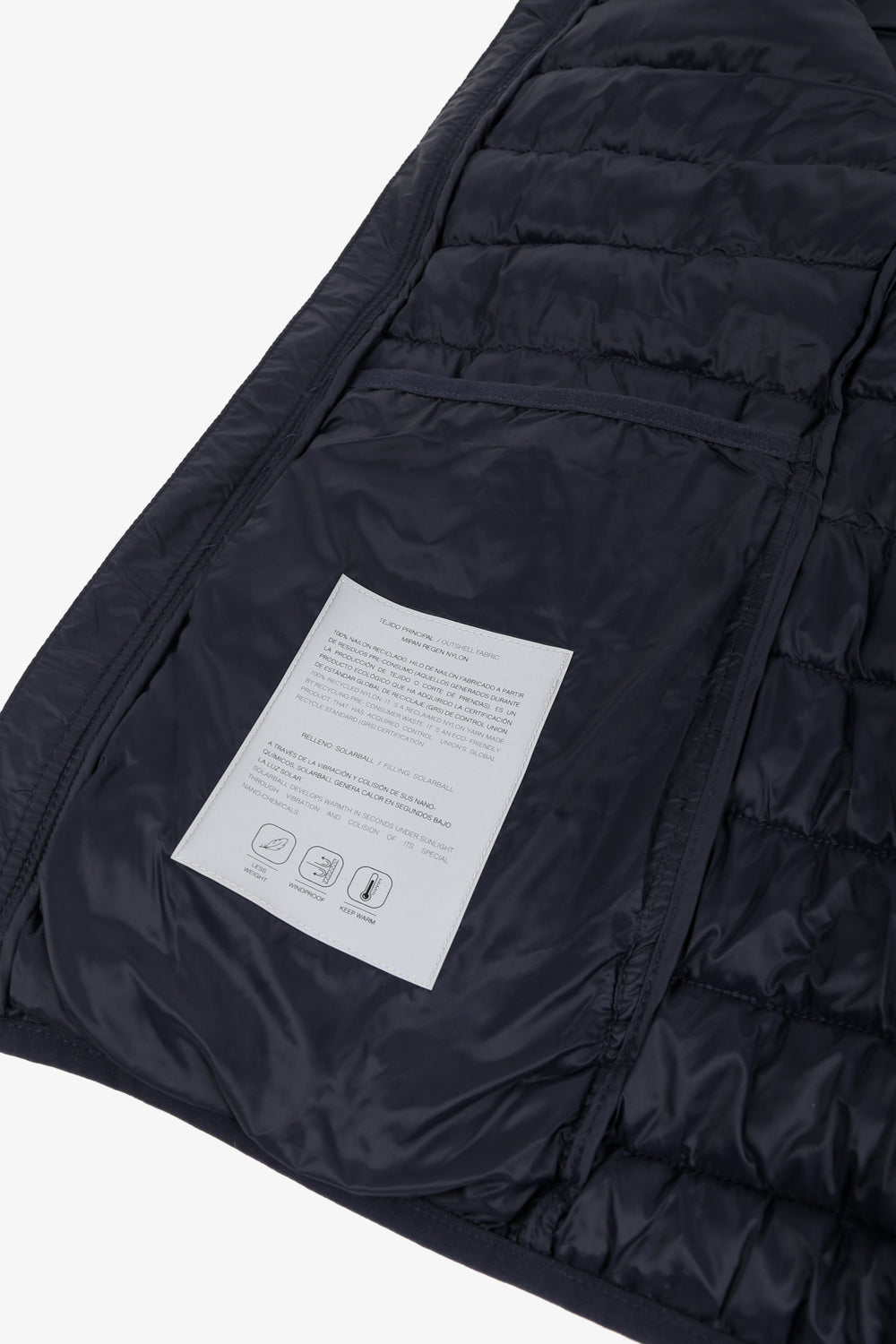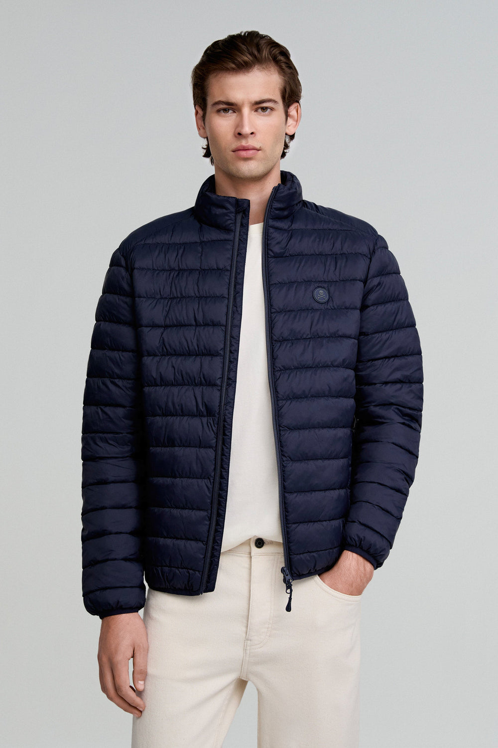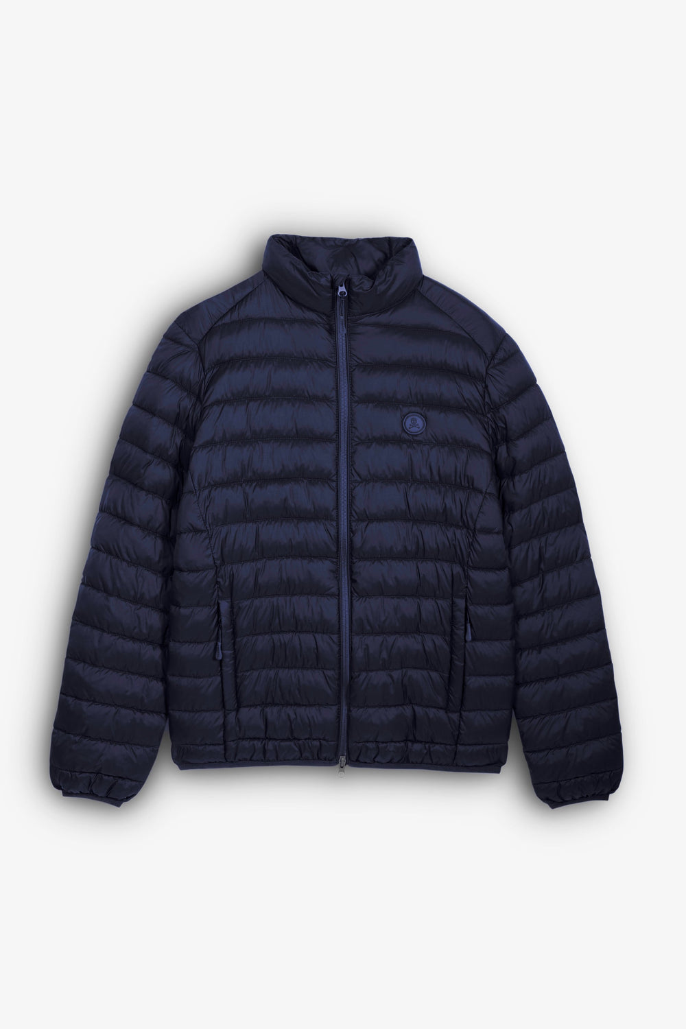 Padded jacket with a rubber skull patch. Crafted from recycled nylon with recycled polyester filling. Regular Fit. High collar. Front zip fastening. Side pockets. Long sleeves with elasticated cuffs. Includes a pouch for storage, designed to double as a travel pillow.