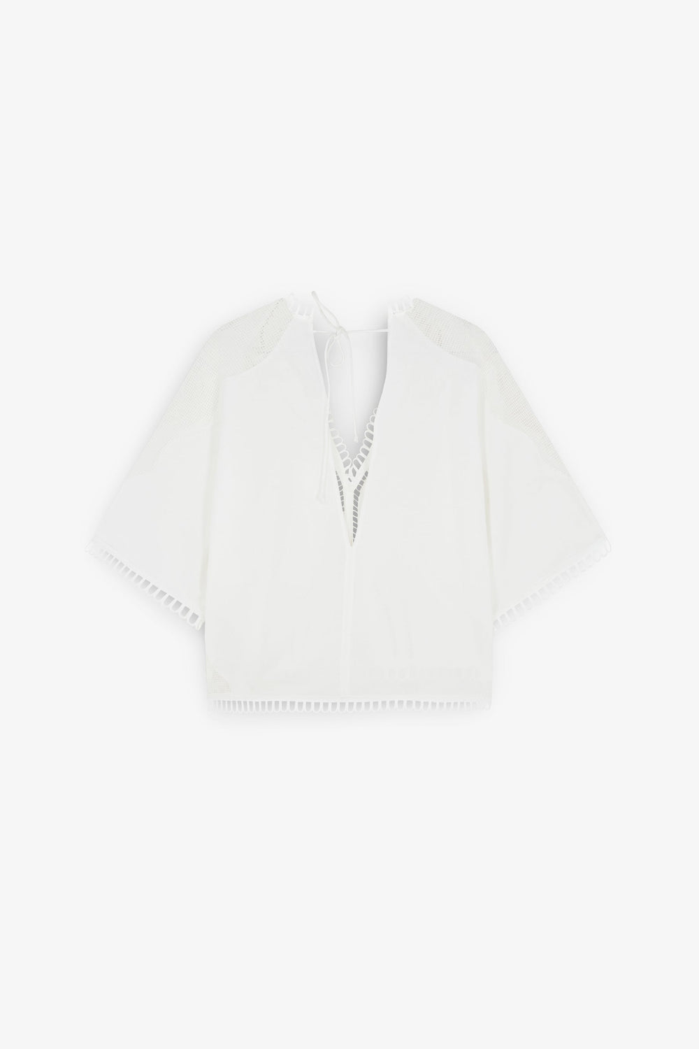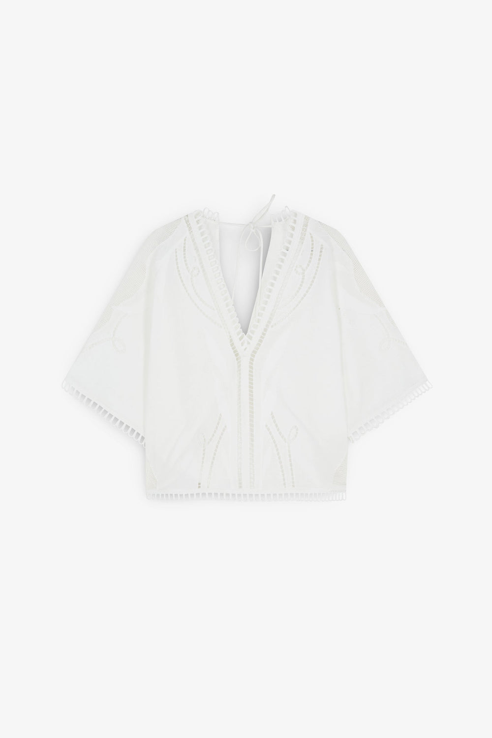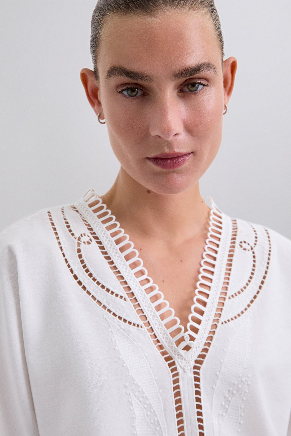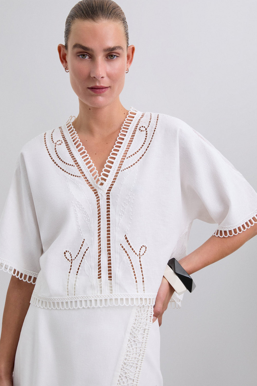 Bluse aus Leinen- und Baumwolle mit Spitzendetails. Leichter Cropped-Schnitt, V-Ausschnitt und kurze Ärmel. Stickereien und Abschlüsse an Ausschnitt, Ärmeln und Saum. Schnürverschluss und Schlitz auf dem Rücken.