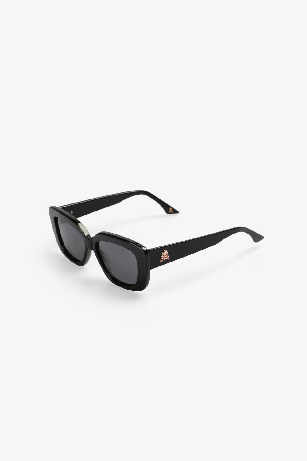 Sonnenbrille aus 100% Acetat. Kontrastfarbener Metallic-Totenkopf an der Seite des Bügels.
