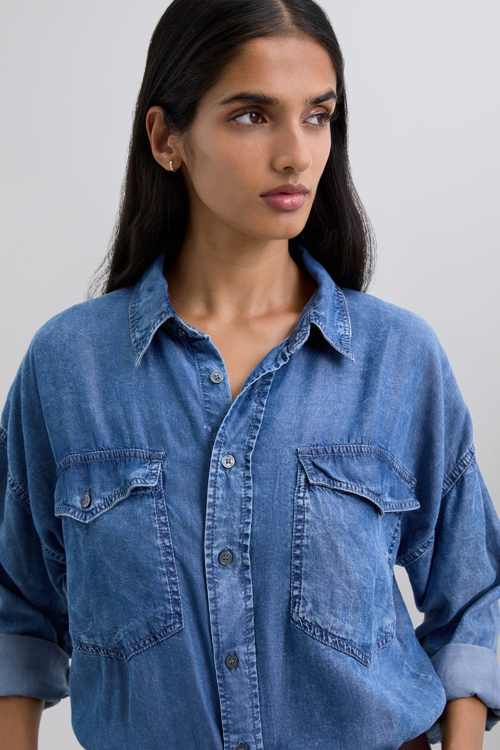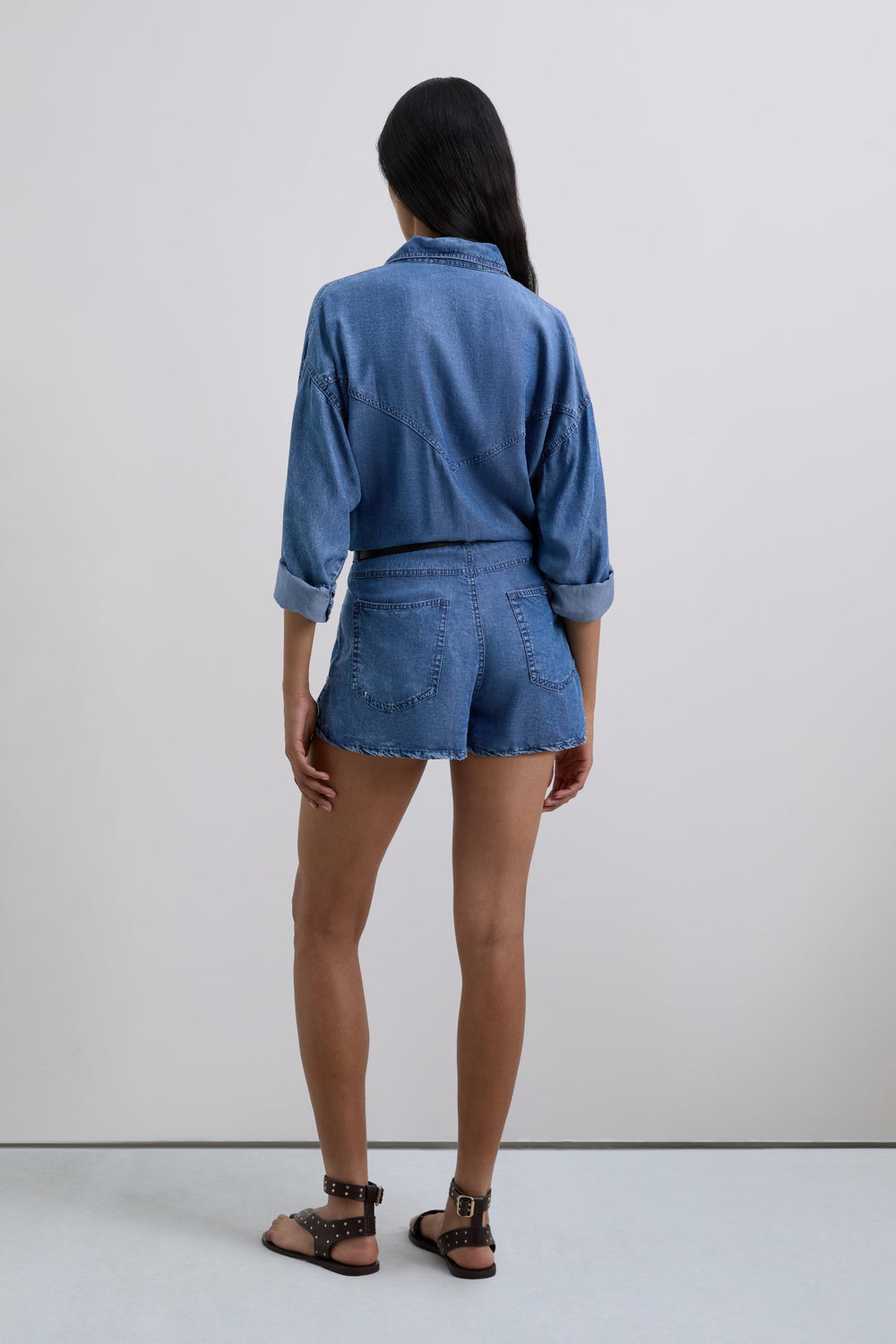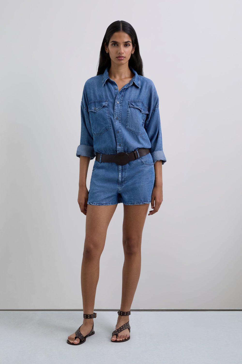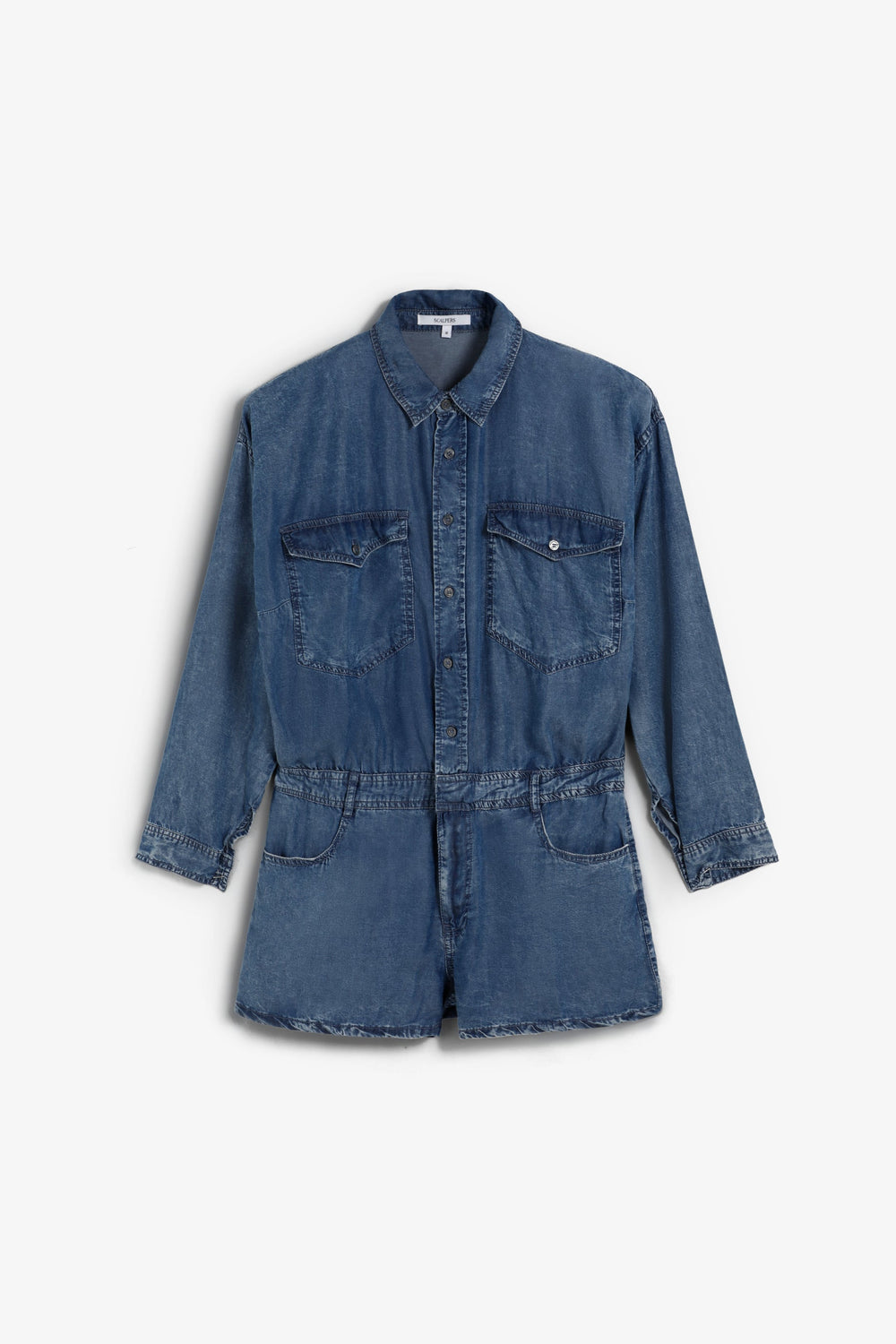 Kurzer Jumpsuit aus fließendem Stoff mit Denim-Effekt. Hemdkragen. Lange Ärmel. Knopfleiste. Taschen vorne und Gesäßtaschen.