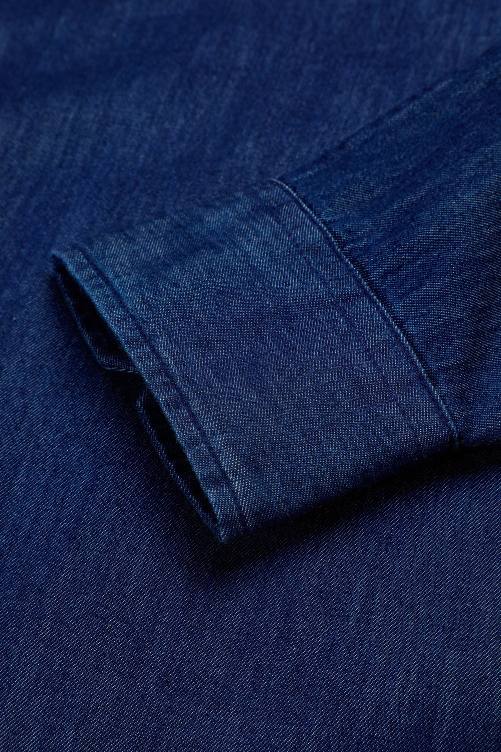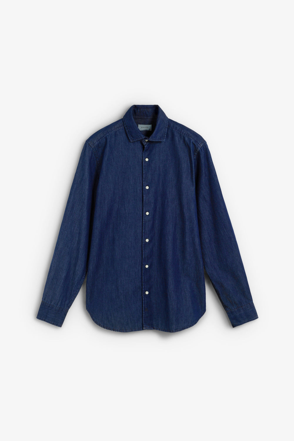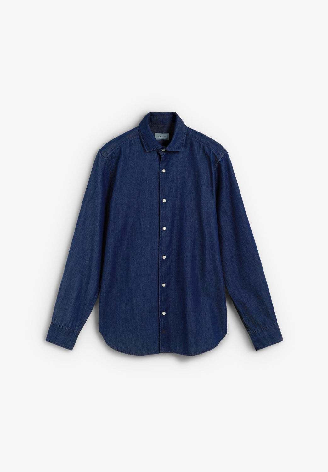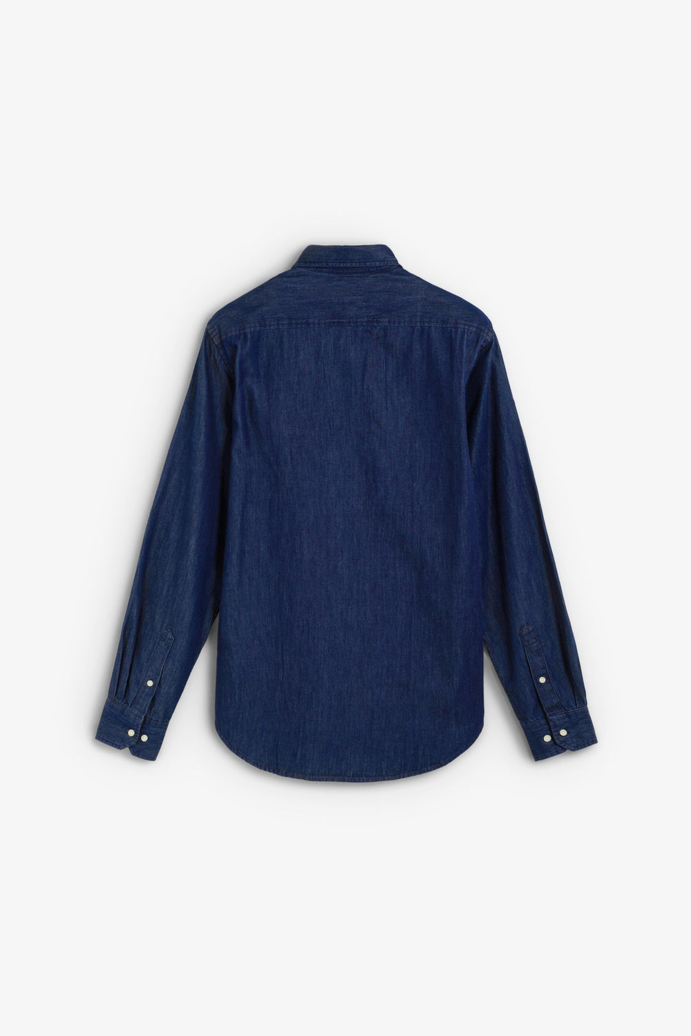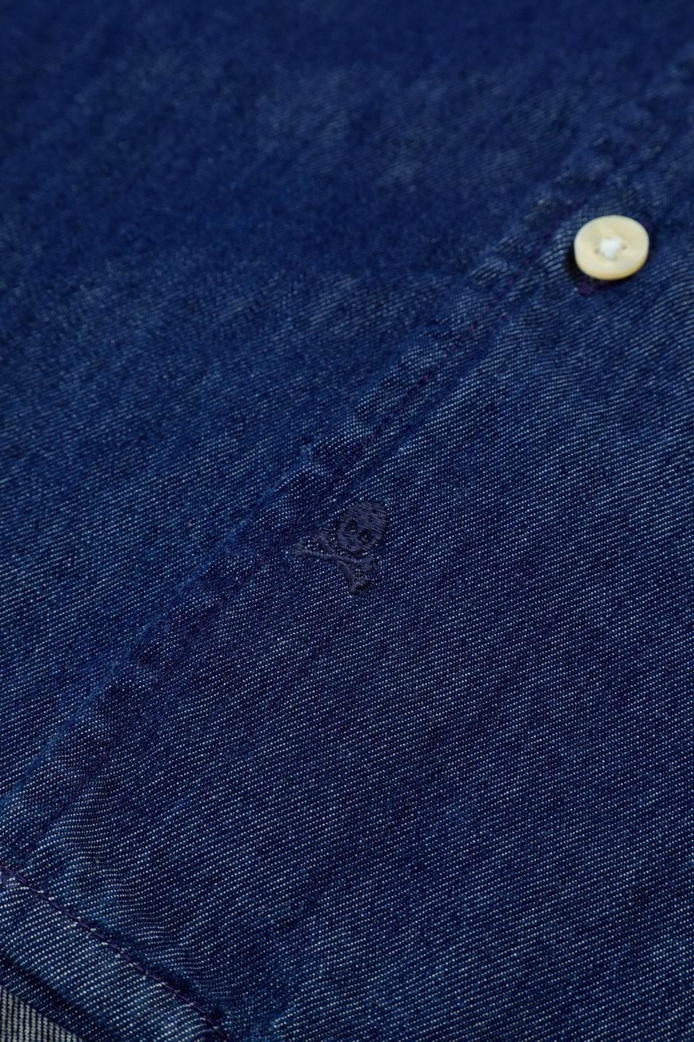 Jeanshemd aus 100% Baumwolle mit Peach-Finish. Regular Fit, italienischer Kragen und Knopfverschluss. Lange Ärmel mit Knopfbündchen. Farblich abgesetzte Totenkopf-Stickerei auf der Brust.
