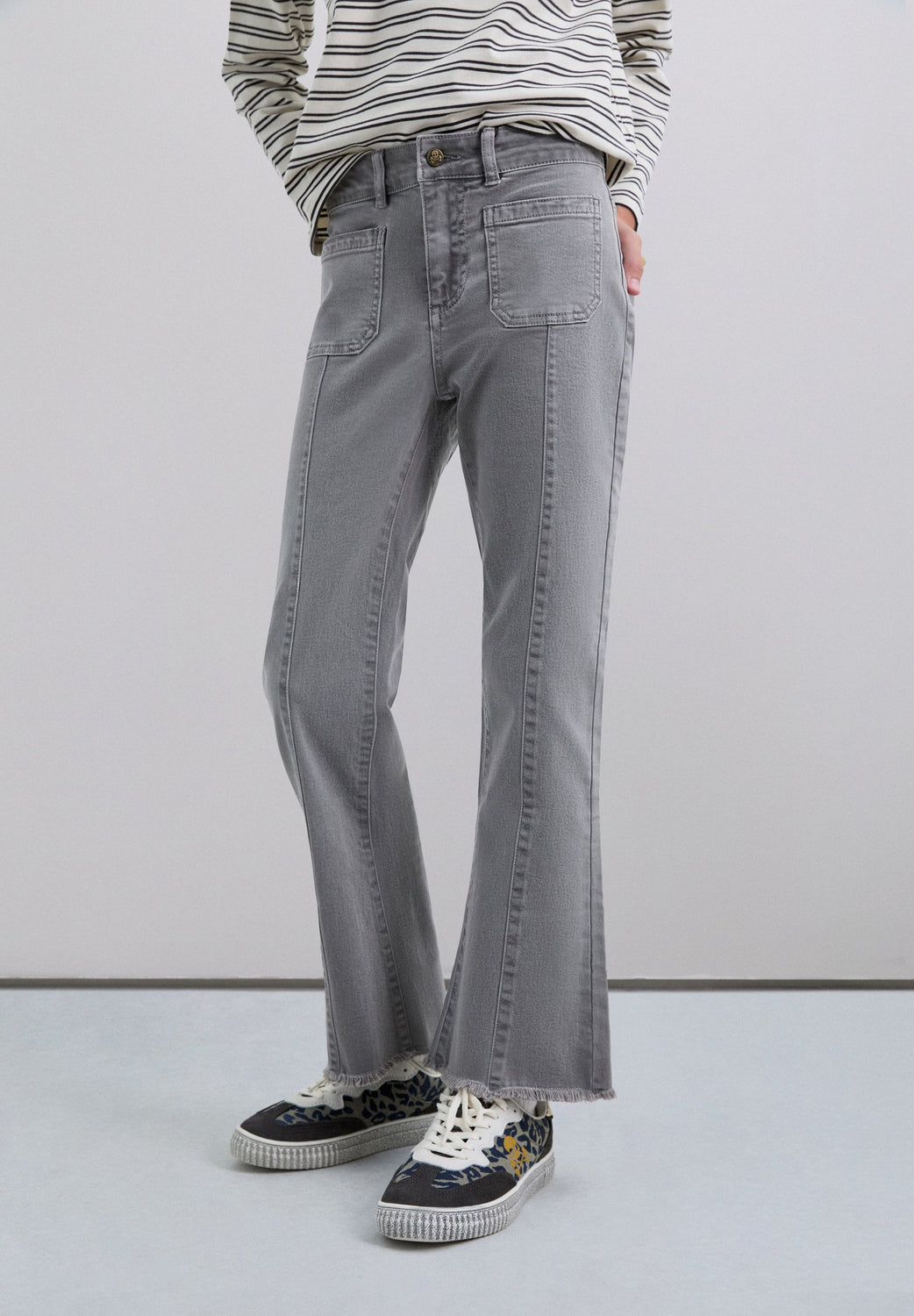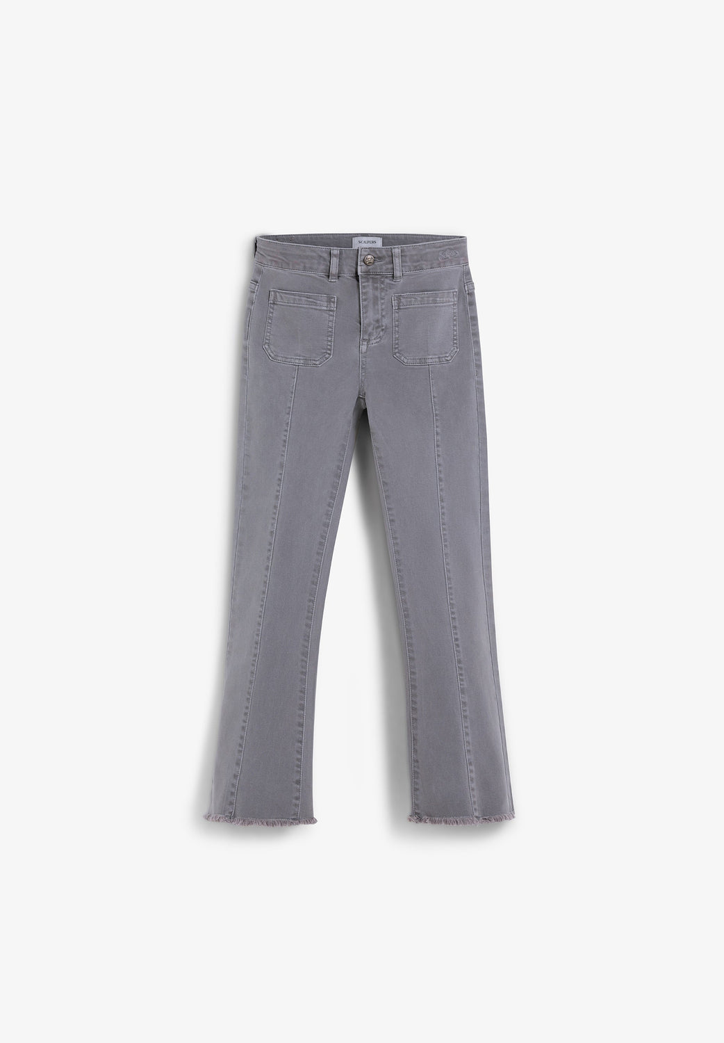 Schlaghose aus BCI-Baumwolle. Mit Reißverschluss mit Knopf. Schnallen am Bund. Taschen vorne und Gesäßtaschen. Ziernaht auf der Vorderseite. Seitenschlitz und ausgefranste Saumenden.