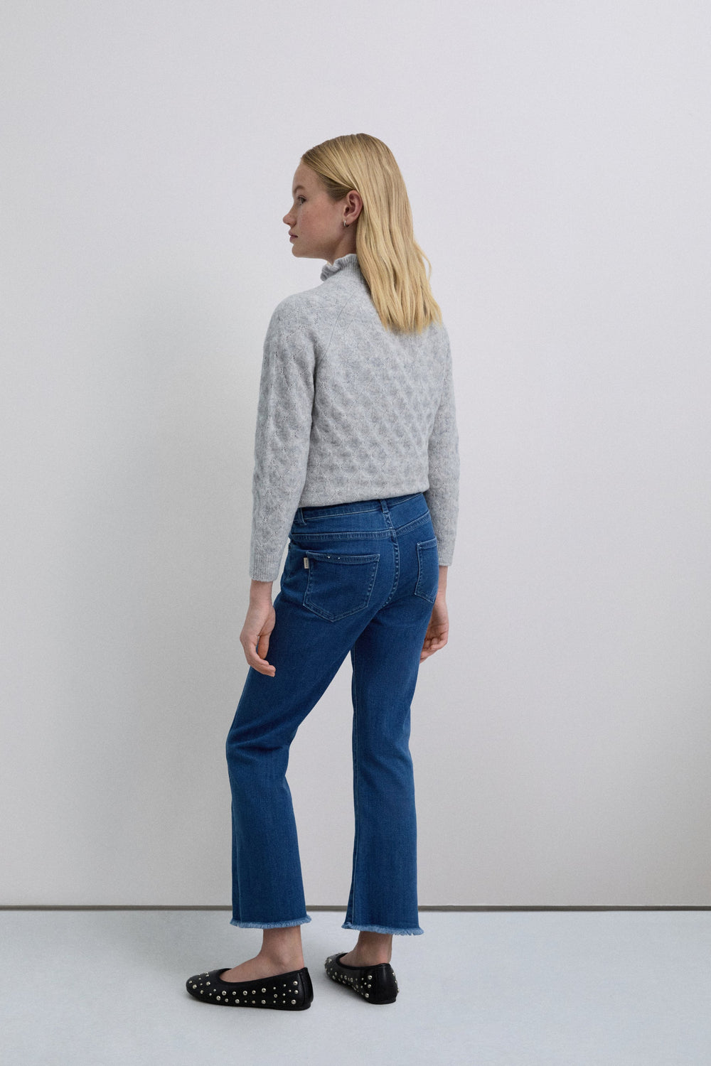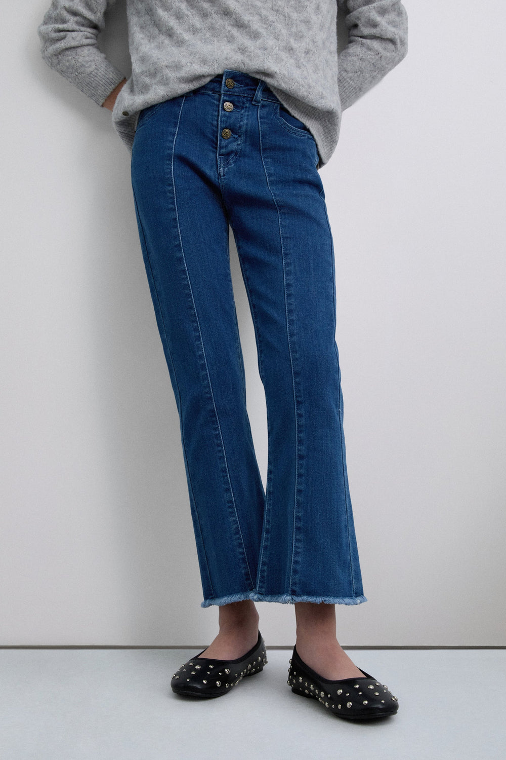 Hose mit leicht elastischer Baumwolle. Schlaghosen-Schnitt. Knopfverschluss mit Totenkopf und Logo. Vordertaschen und aufgenähte Gesäßtaschen. Saum mit Fransen und Nähten vorne.