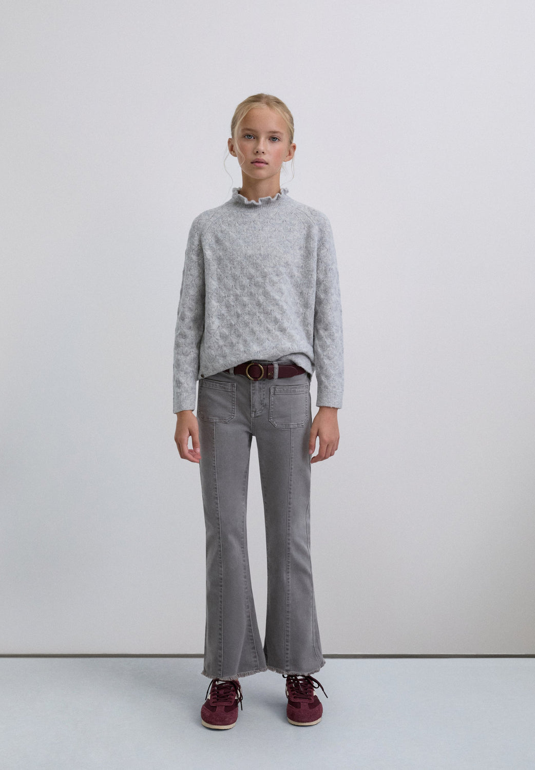 Strickpullover mit Merinowolle. Gerippter Stehkragen mit Volants. Lange Ärmel mit Rippstoff-Saum. Lochmuster-Motiv mit Rautenmuster.