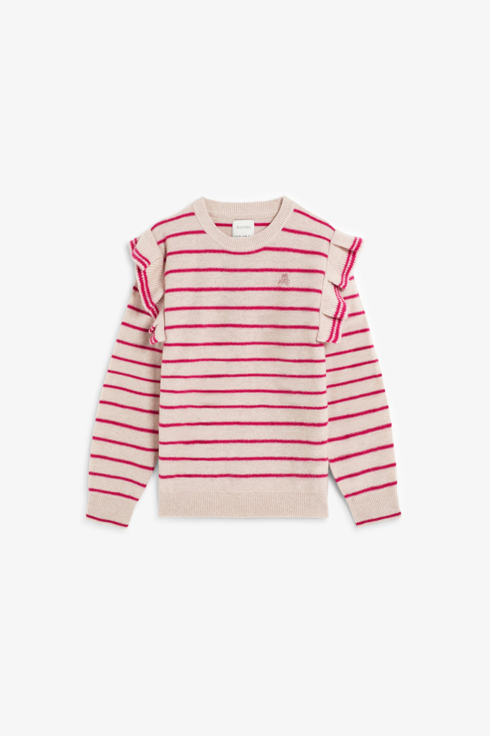 Pullover aus Wolle. Streifen-Print. Rundausschnitt. Volants an den Schultern. Farblich passende Totenkopf-Stickerei auf der Brust. Patentbündchen am Saum.