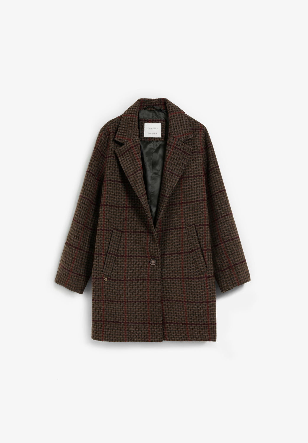 Karierter Stoffmantel. Reverskragen. Knopfleiste. Lange Ärmel. Nahttaschen mit Patte.
