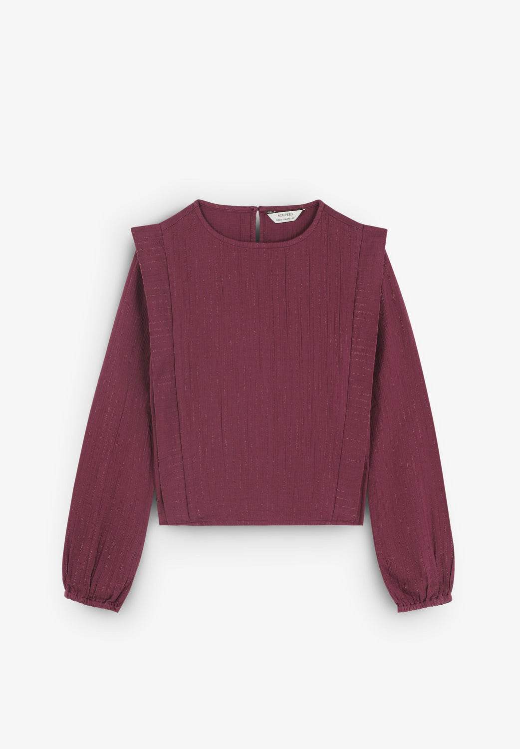 Bluse aus BCI-Baumwolle. Rundausschnitt. Falten vorne. Rippstoff-Details. Lange Ärmel. Gummizugbündchen. Knopfverschluss hinten.
