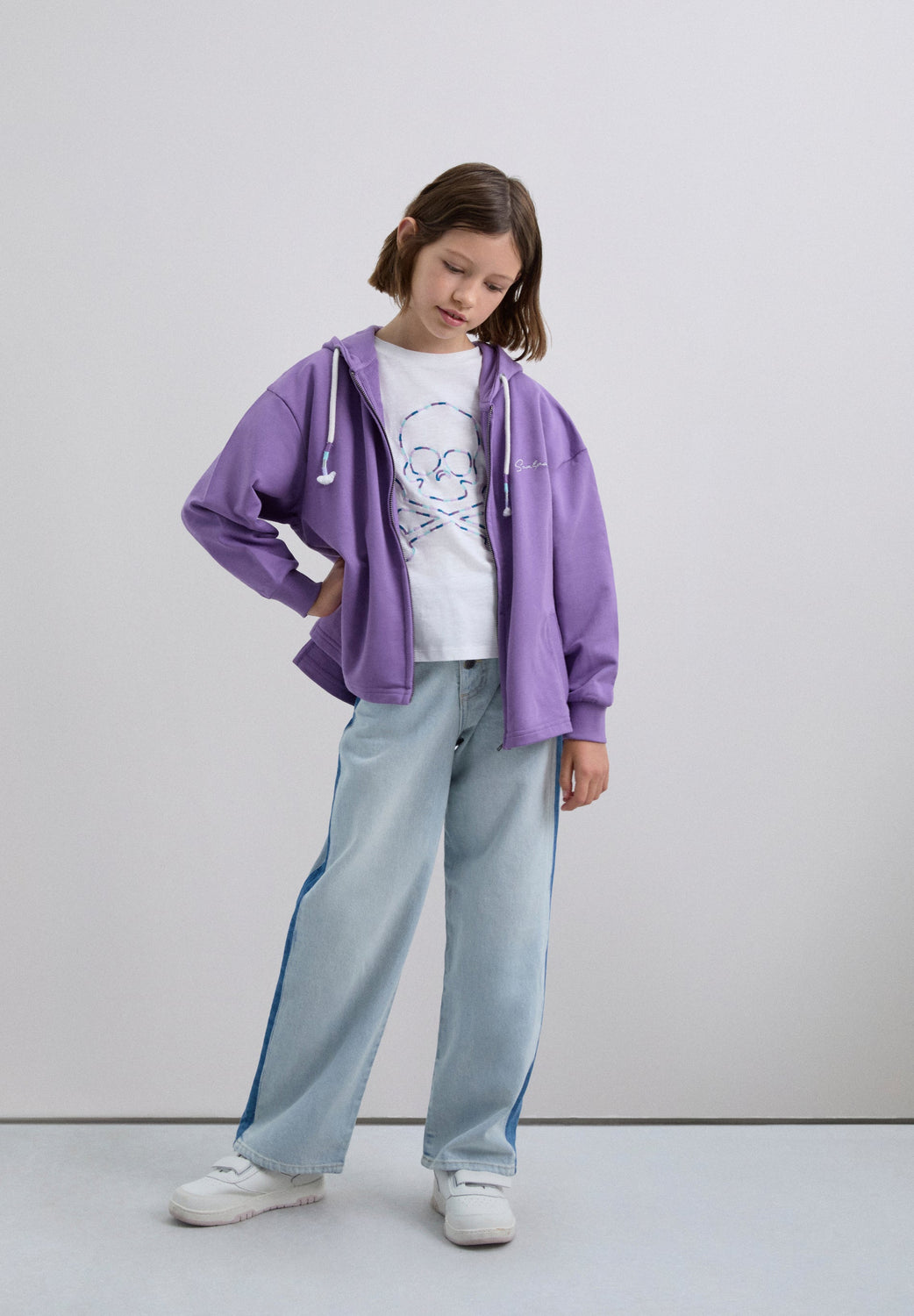 Hoody mit verstellbarer Kapuze mit Kordelzug. Reißverschluss vorne. Lange Ärmel mit Patentbündchen. Logo-Stickerei auf der Brust und Totenkopf mit Nieten auf dem Rücken.