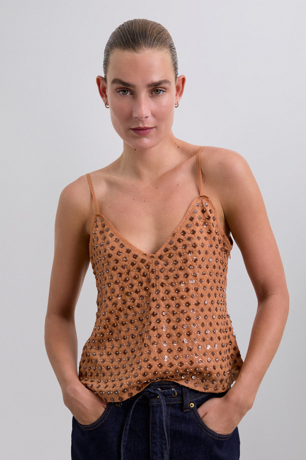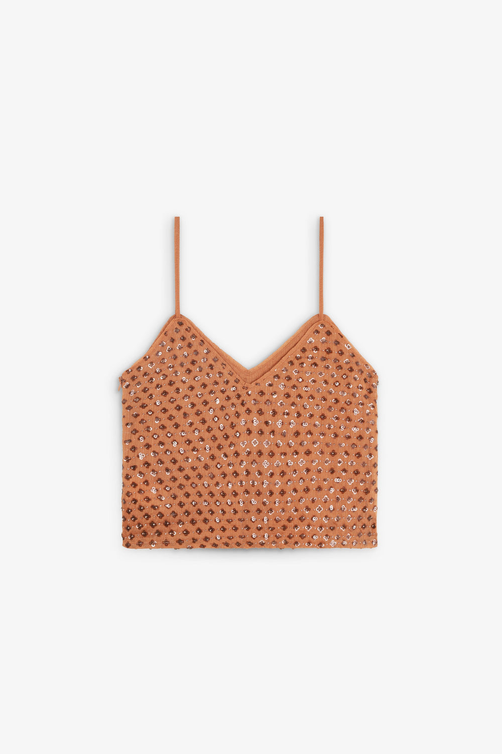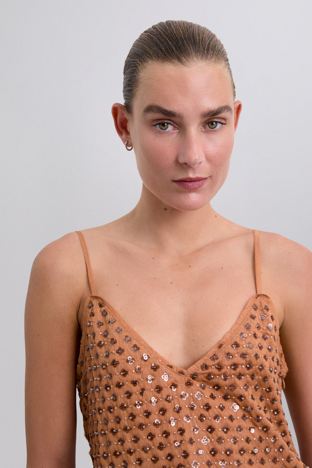 Top mit V-Ausschnitt und schmalen Trägern. Mit Paillettenapplikation. Seitlicher Reißverschluss.