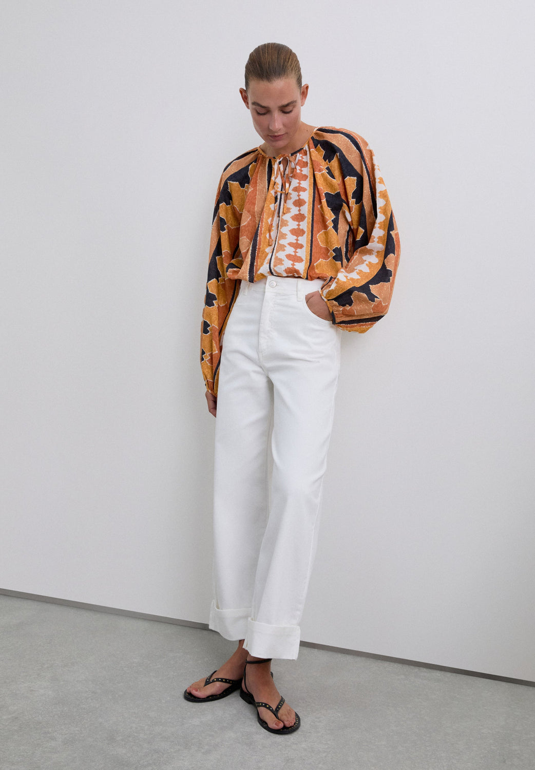 Culotte-Hose aus Denim mit halbhohem Bund. Relaxed Fit. Mit Falten am unteren Ende. Taschen vorne und Gesäßtaschen. Knopfverschluss und Schnallen am Bund. Logo auf dem Gesäßetikett.