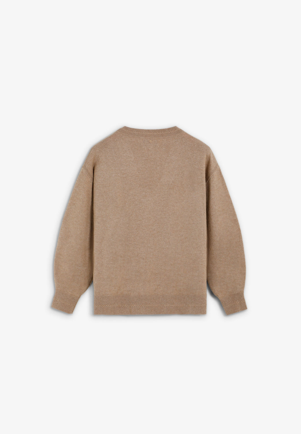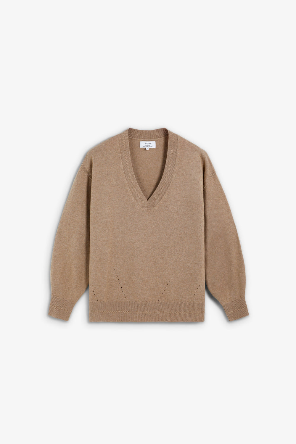 Pullover aus Wolle. V-Ausschnitt mit leicht lockerem Schnitt. Mini-Lochmuster in der Nähe des oberen Saums. Patentbündchen an Kragen, Bündchen und Bund. Metall-Plakette mit Logo auf dem Rücken.