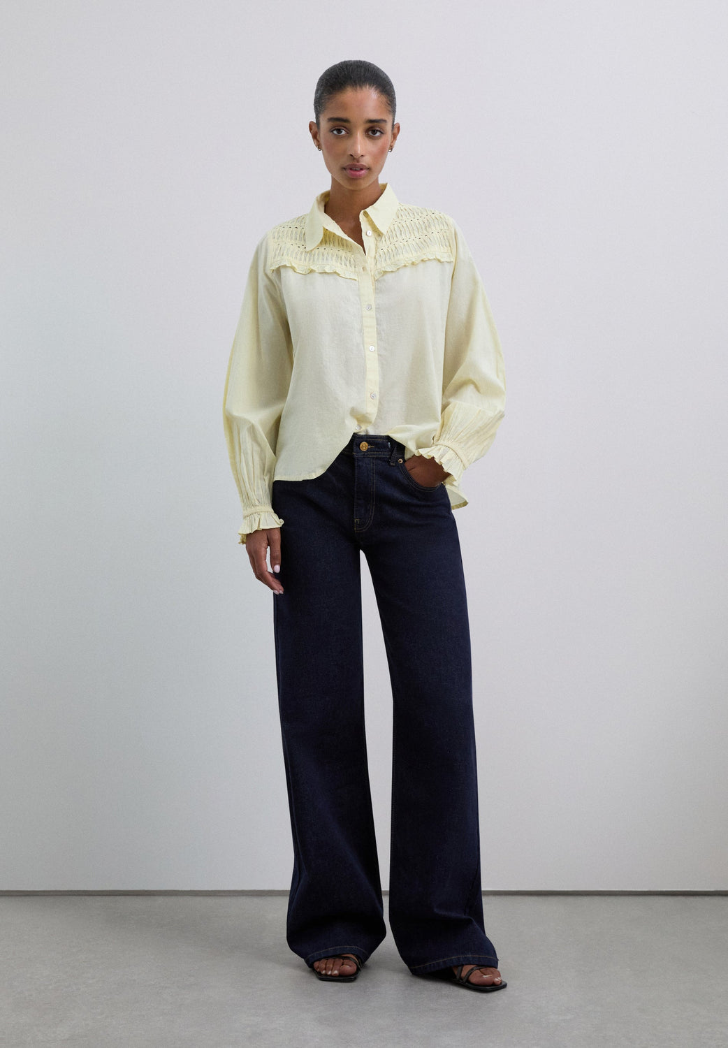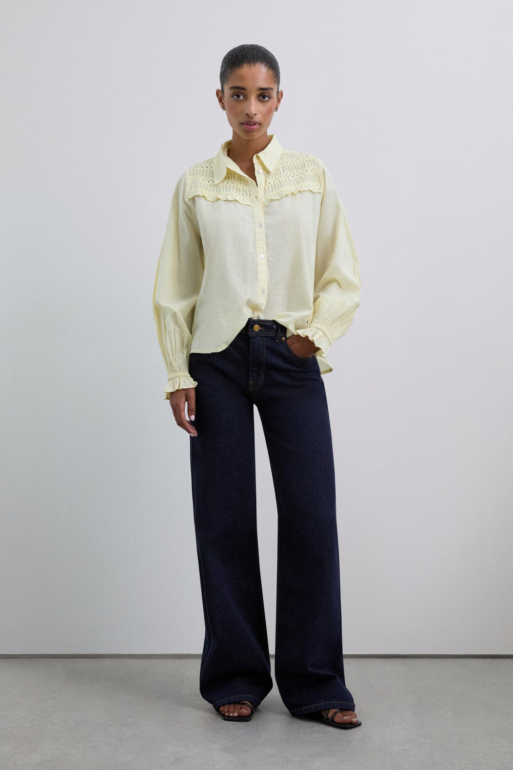Bluse aus reiner Baumwolle. Regular Fit. Klassischer Kragen. Passe auf der Brust. Lange Ärmel mit elastischem leichtem Volant-Bündchen. Knopfleiste.