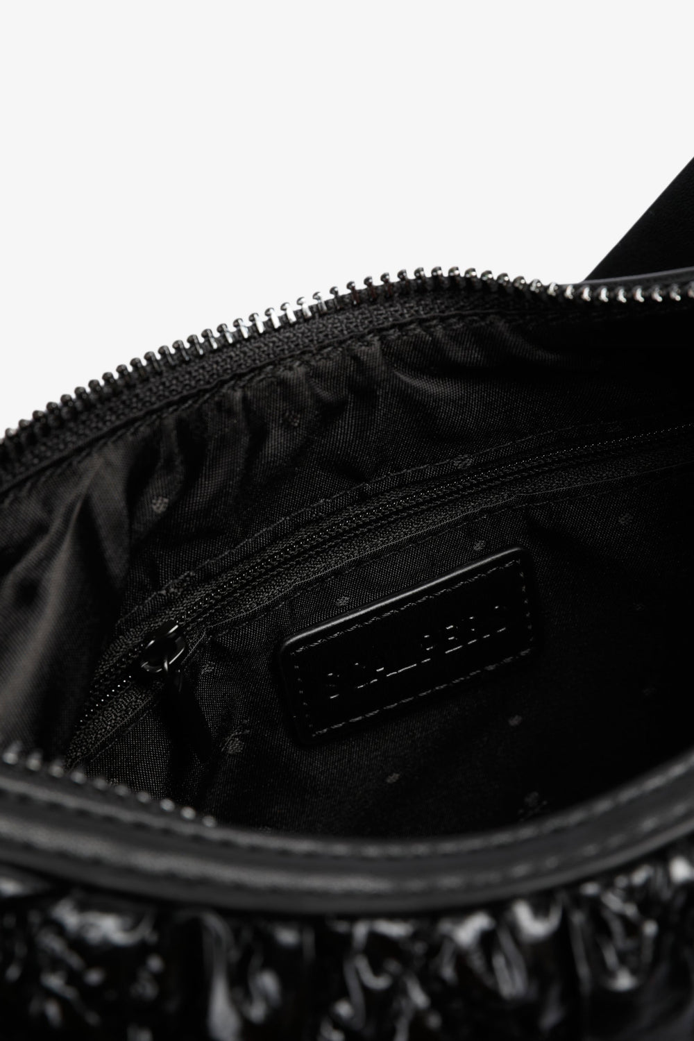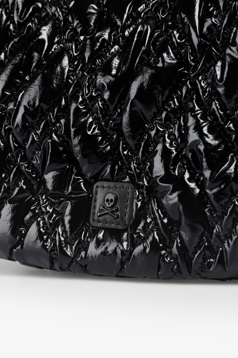 Gesteppte Schultertasche aus PU. Innenfütterung mit Reißverschluss und Reißverschluss. Doppelte Tragegurt-Option: kurzer Tragegurt und Kette. Logo-Aufnäher vorne.