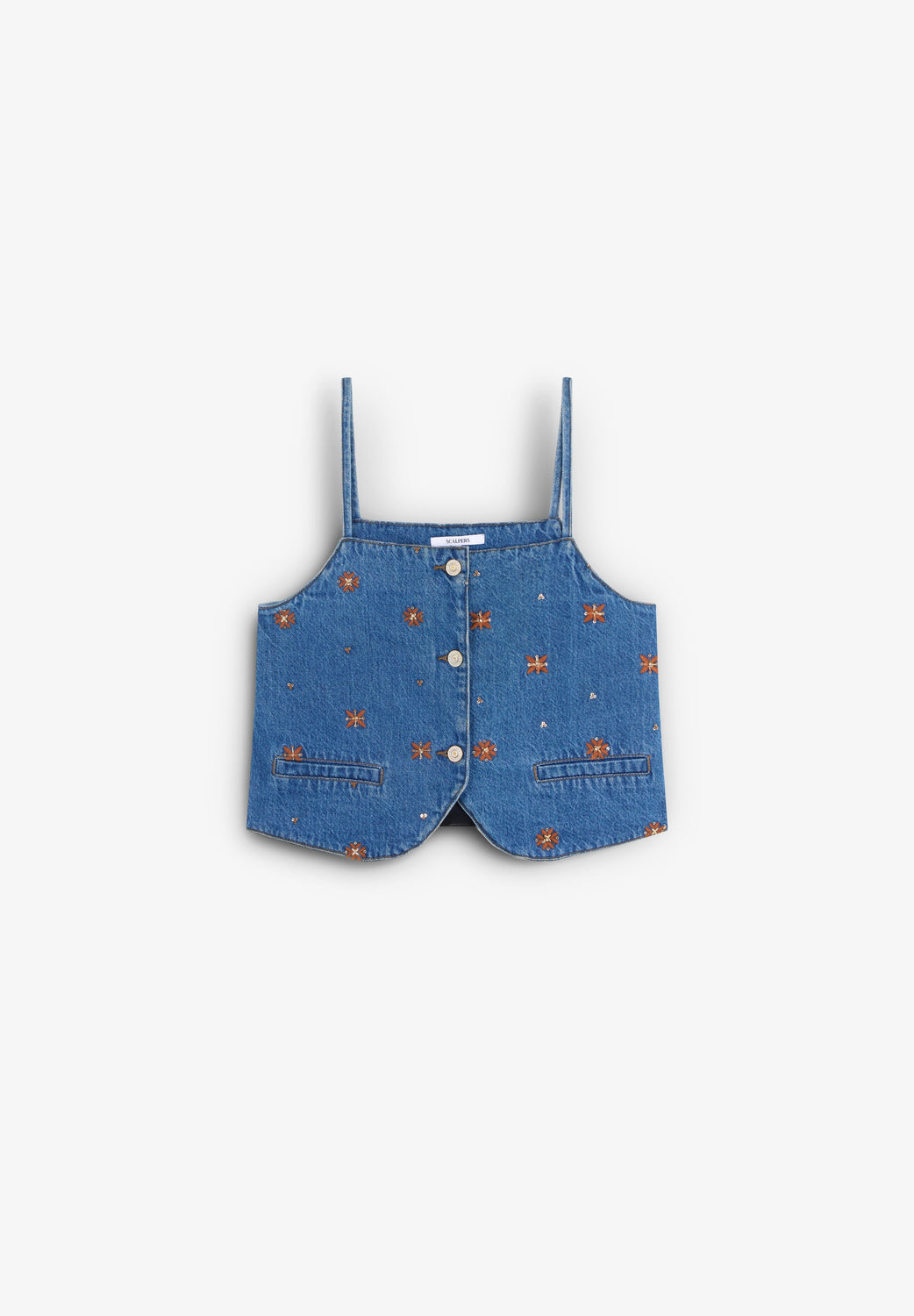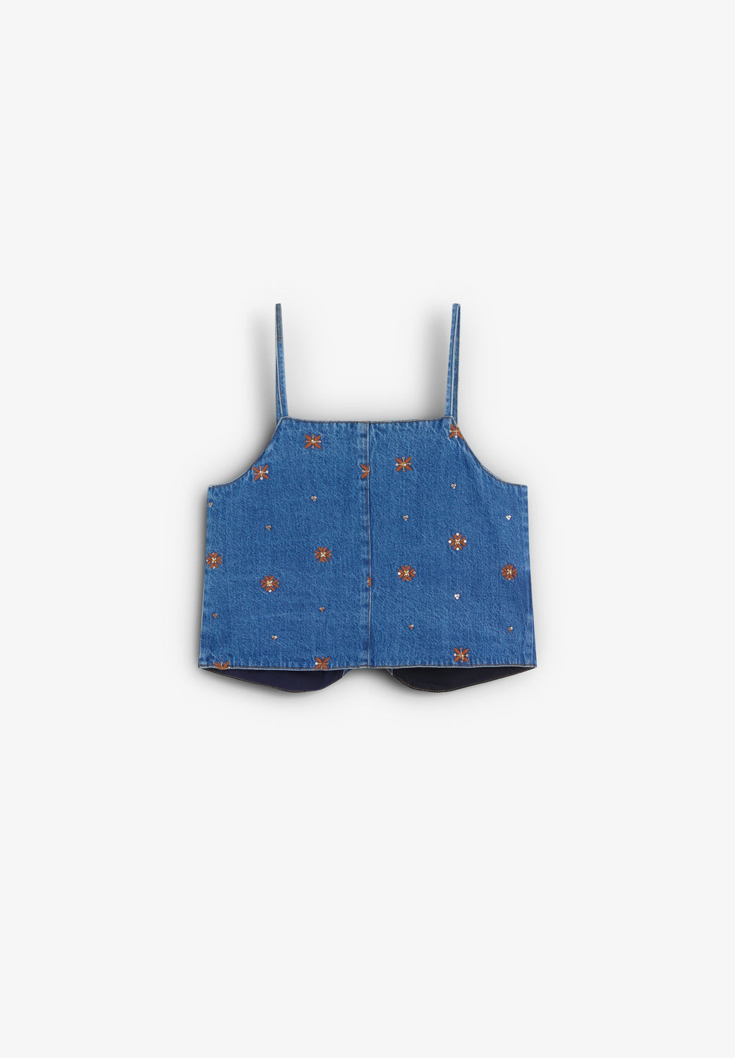 Trägertop aus Baumwolle. Blumenmotiv-Stickereien. Knopfverschluss vorne. Vordere Taschen.