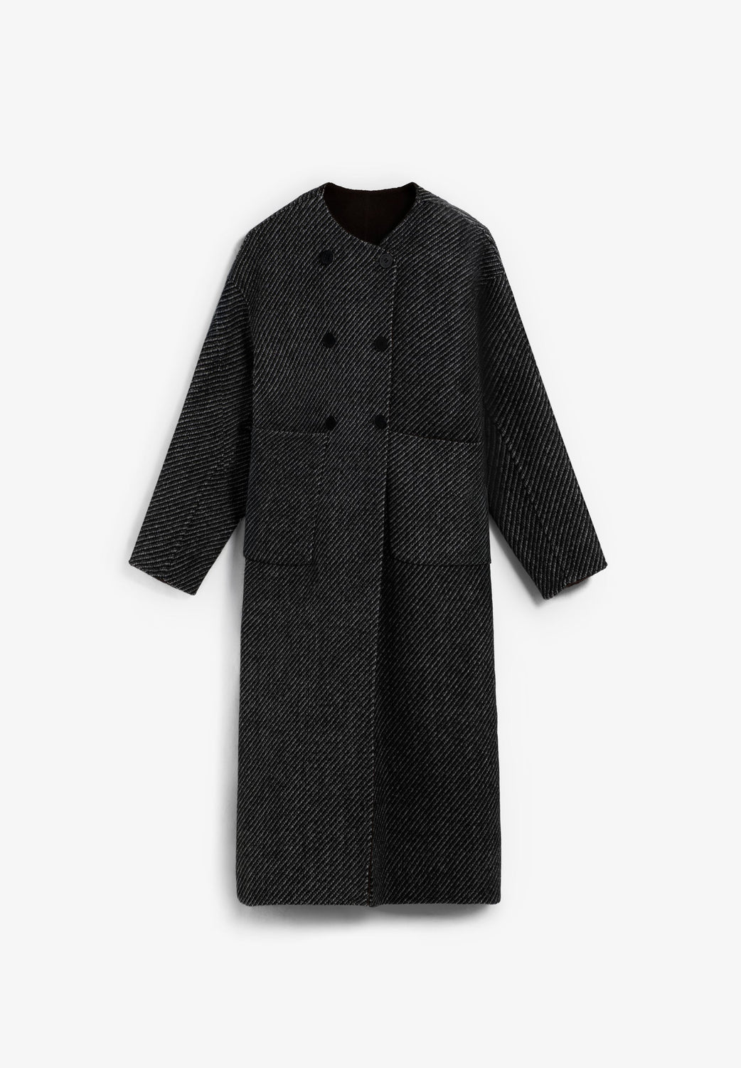 Langer Wendemantel aus Wollgemisch. Regular Fit. Rundausschnitt Kragen ohne Revers. Option Fischgrätenmuster in Grau oder einfarbig in Braun. Aufgenähte Taschen in Fischgrät-Optik und schräge Taschen in einfarbiger Wende-Optik.