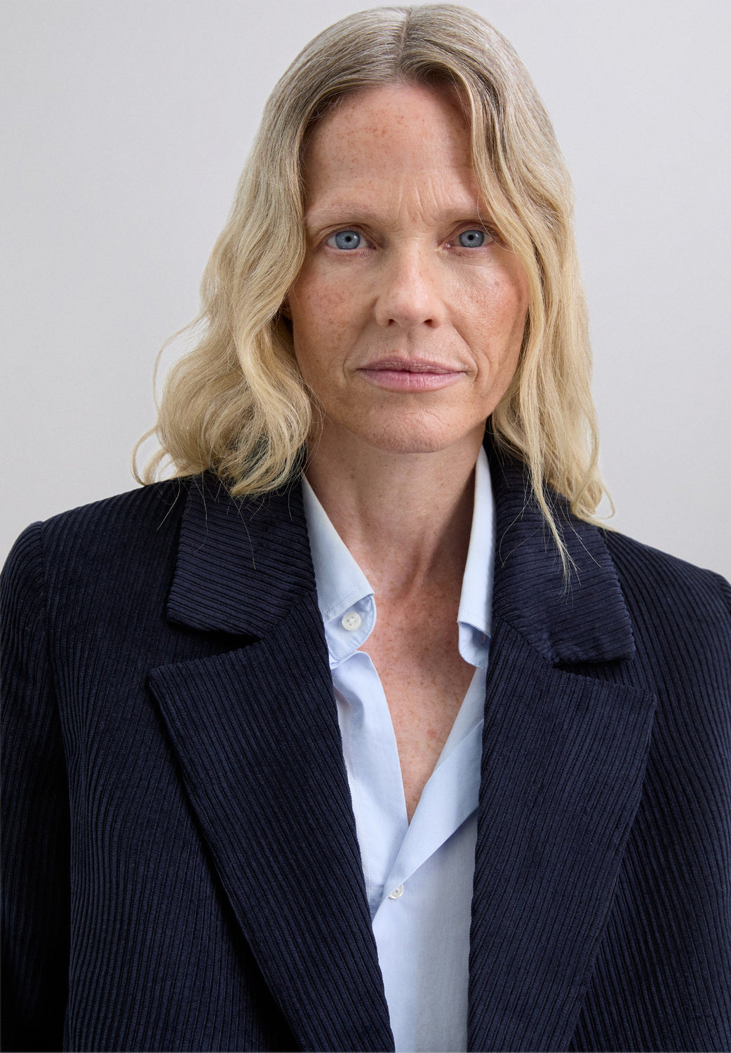 Blazer aus Cord mit fallendem Revers. Lange Ärmel. Zweireihiger Knopfverschluss vorne. Zwei Pattentaschen vorne. Knopfverschluss an den Bündchen.
