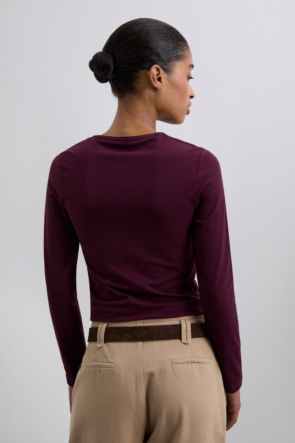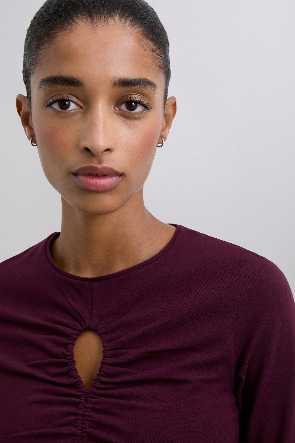 Shirt aus leicht elastischer Baumwolle. Slim-Fit, Rundausschnitt und lange Ärmel. Schlitz am Ausschnitt und Raffungen vorne.