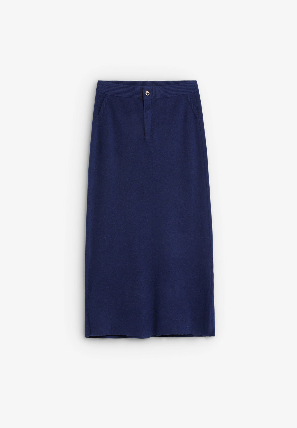 Langer Strickrock mit Baumwolle. Midi-Schnitt. Knopfverschluss. Gummizugbund mit Patentbündchen am Saum.
