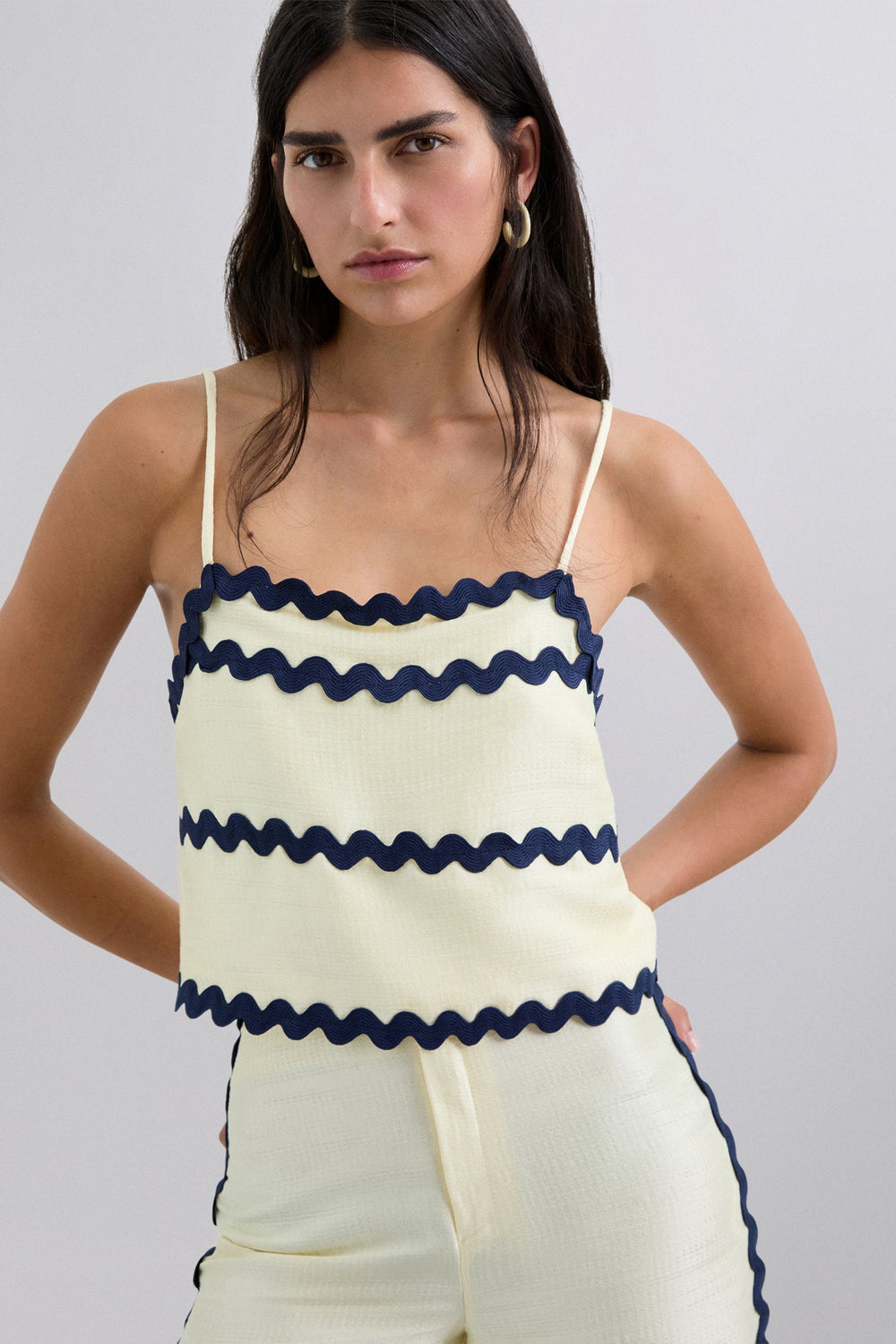 Top mit schmalen Trägern und geradem Ausschnitt. Farblich abgesetzte Wellen. Cropped-Fit.