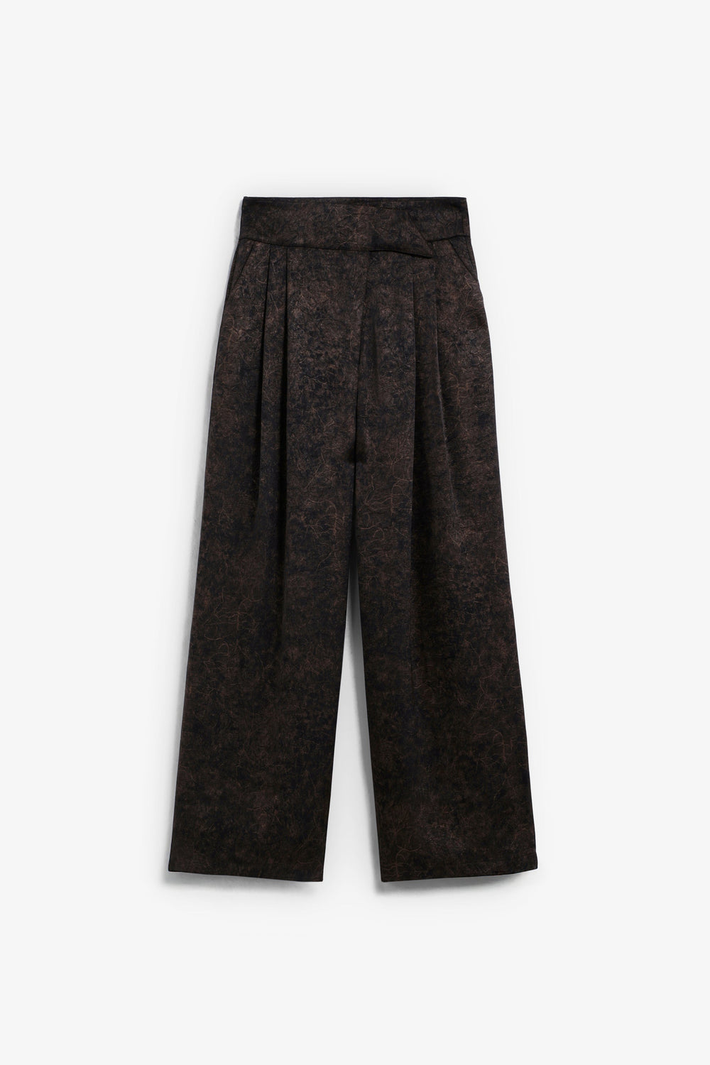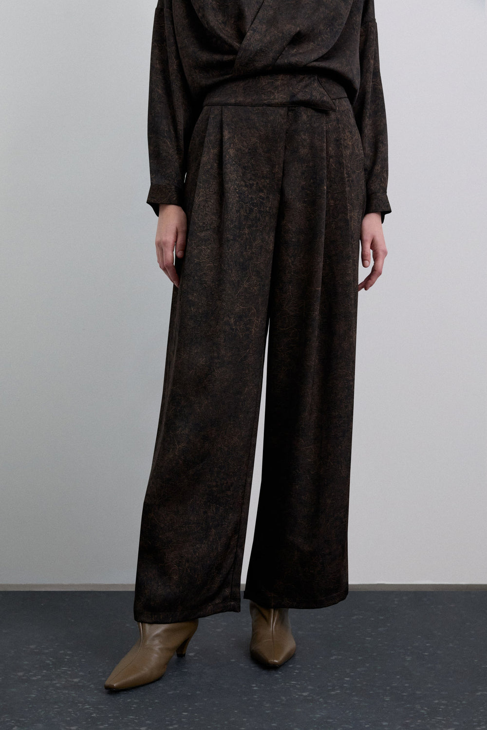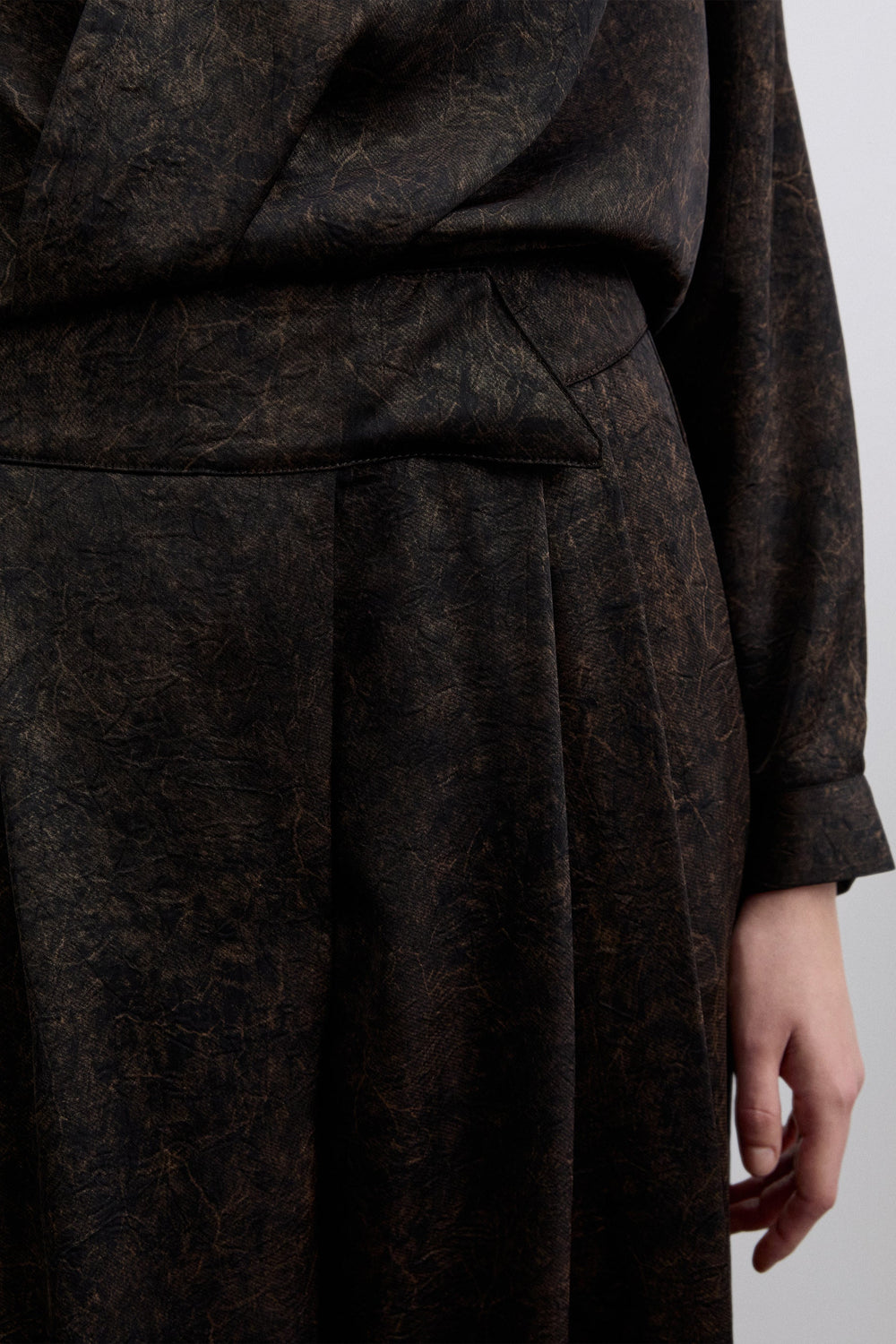 Hose aus fließendem Gewebe mit satiniertem Finish. Print in Marmoroptik. Culotte-Schnitt. Reißverschluss vorne und Seitentaschen.
