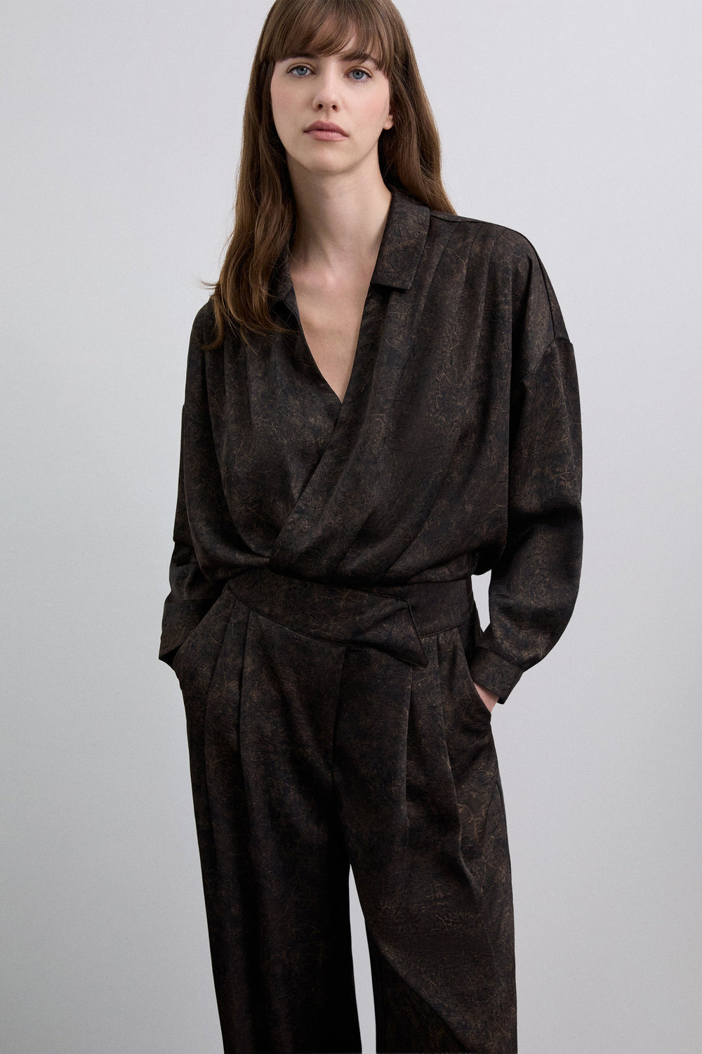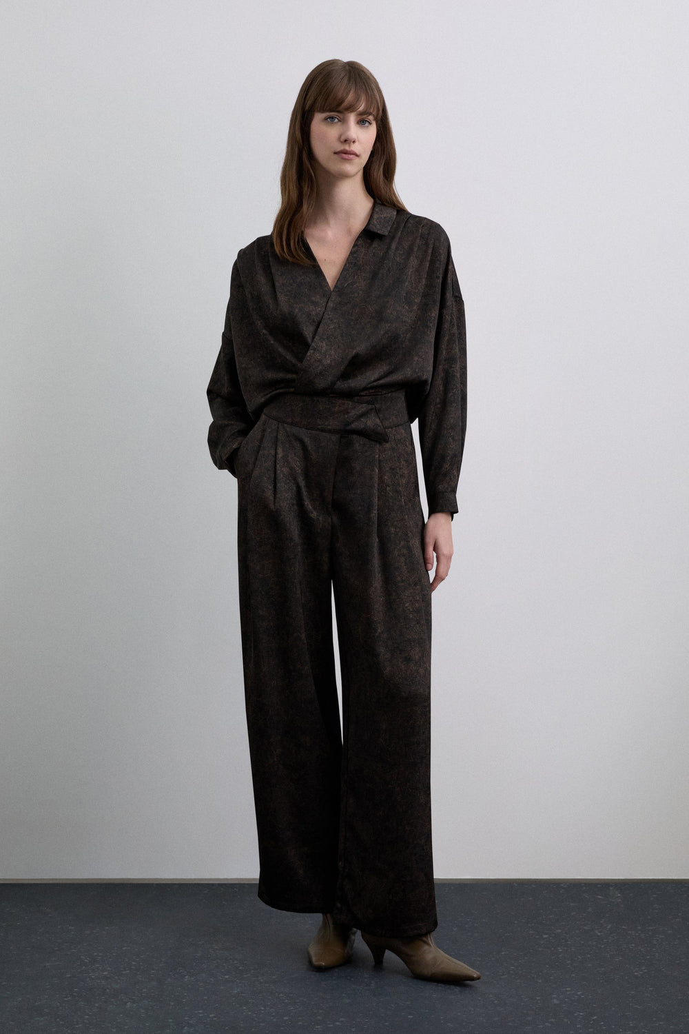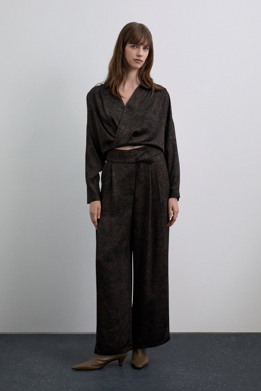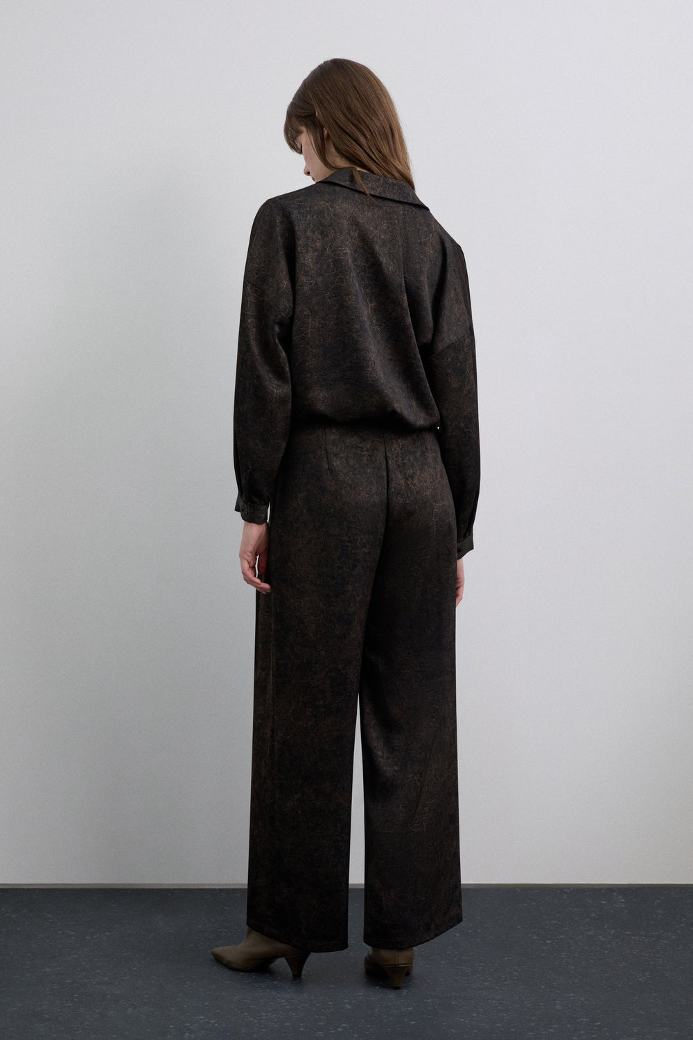 Hose aus fließendem Gewebe mit satiniertem Finish. Print in Marmoroptik. Culotte-Schnitt. Reißverschluss vorne und Seitentaschen.