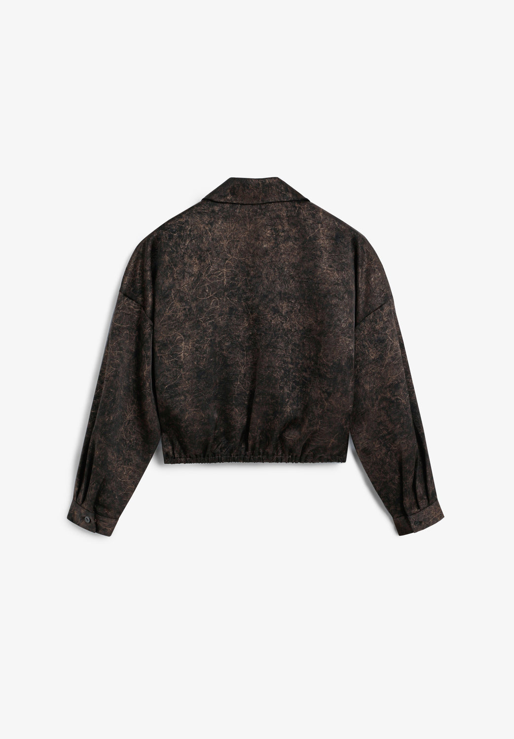 Satiniertes Hemd mit überkreuztem Ausschnitt, langen Ärmeln und klassischem Kragen. Plisées an den Schultern. Die Ärmel haben einen Knopfverschluss.