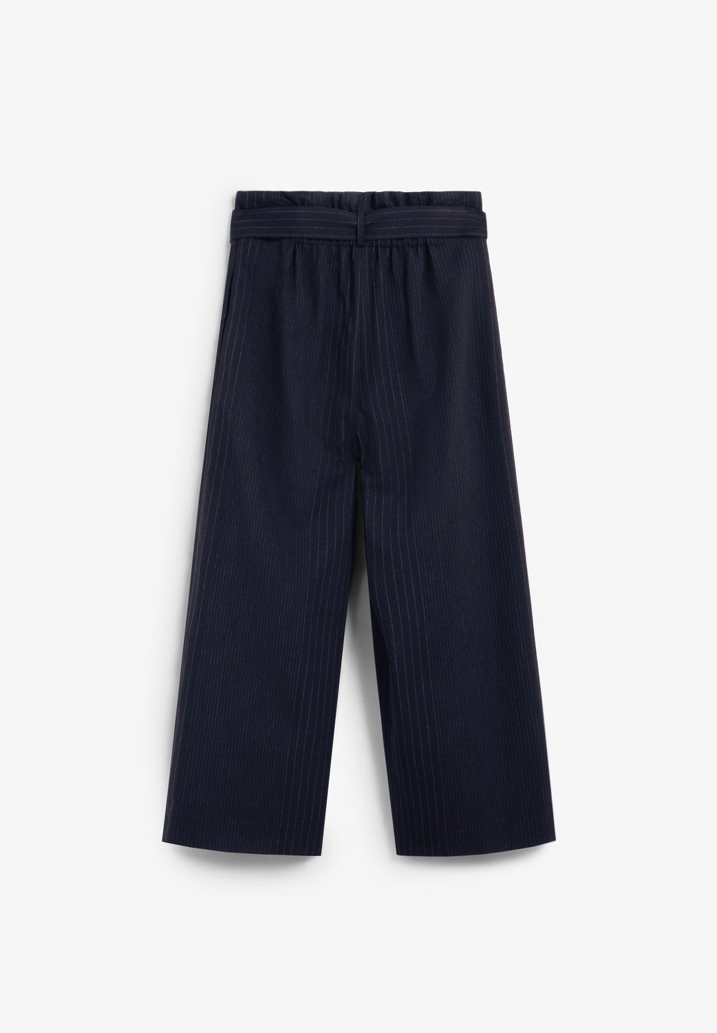 Culotte-Hose mit Nadelstreifen aus 100 % Baumwolle. Hoher Schnitt. Schnallen am Bund. Verdeckter Reißverschluss mit Patte, Haken, Knopfloch und Knopf. Zwei Seitentaschen.