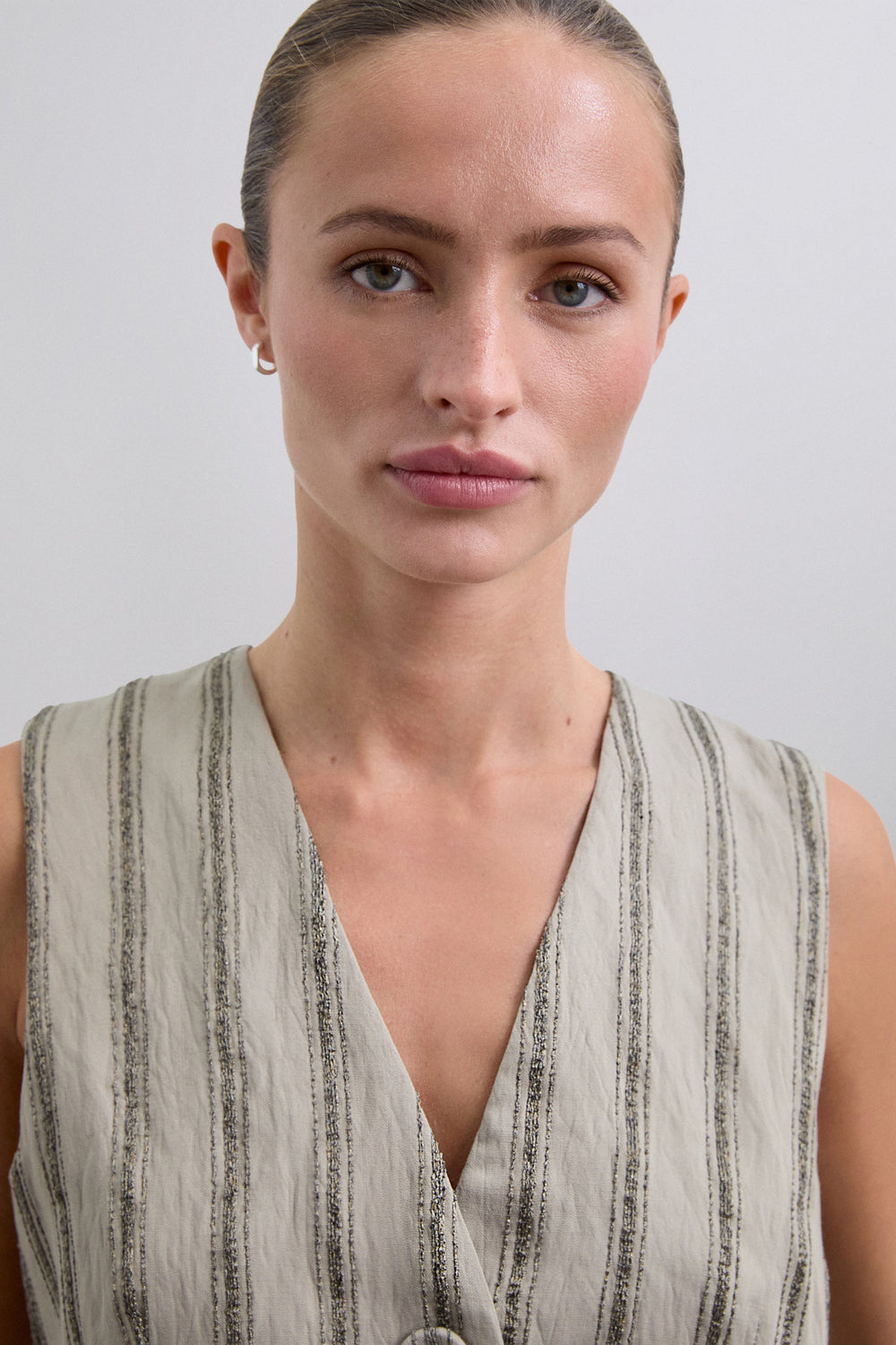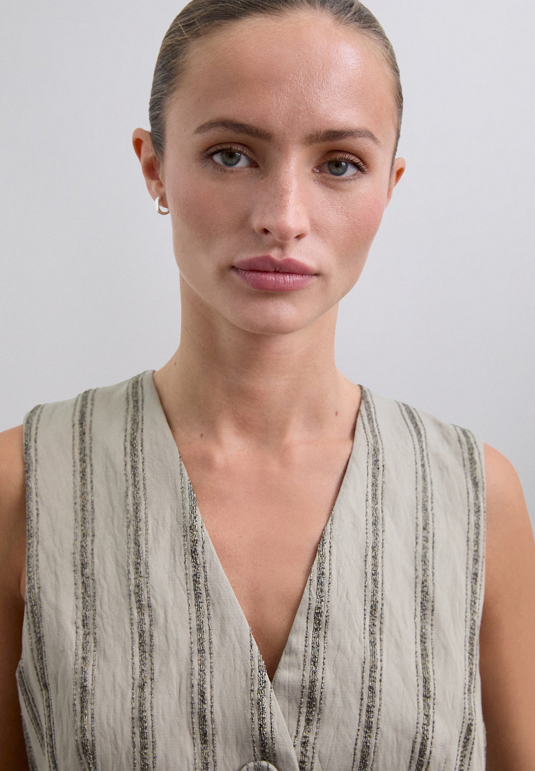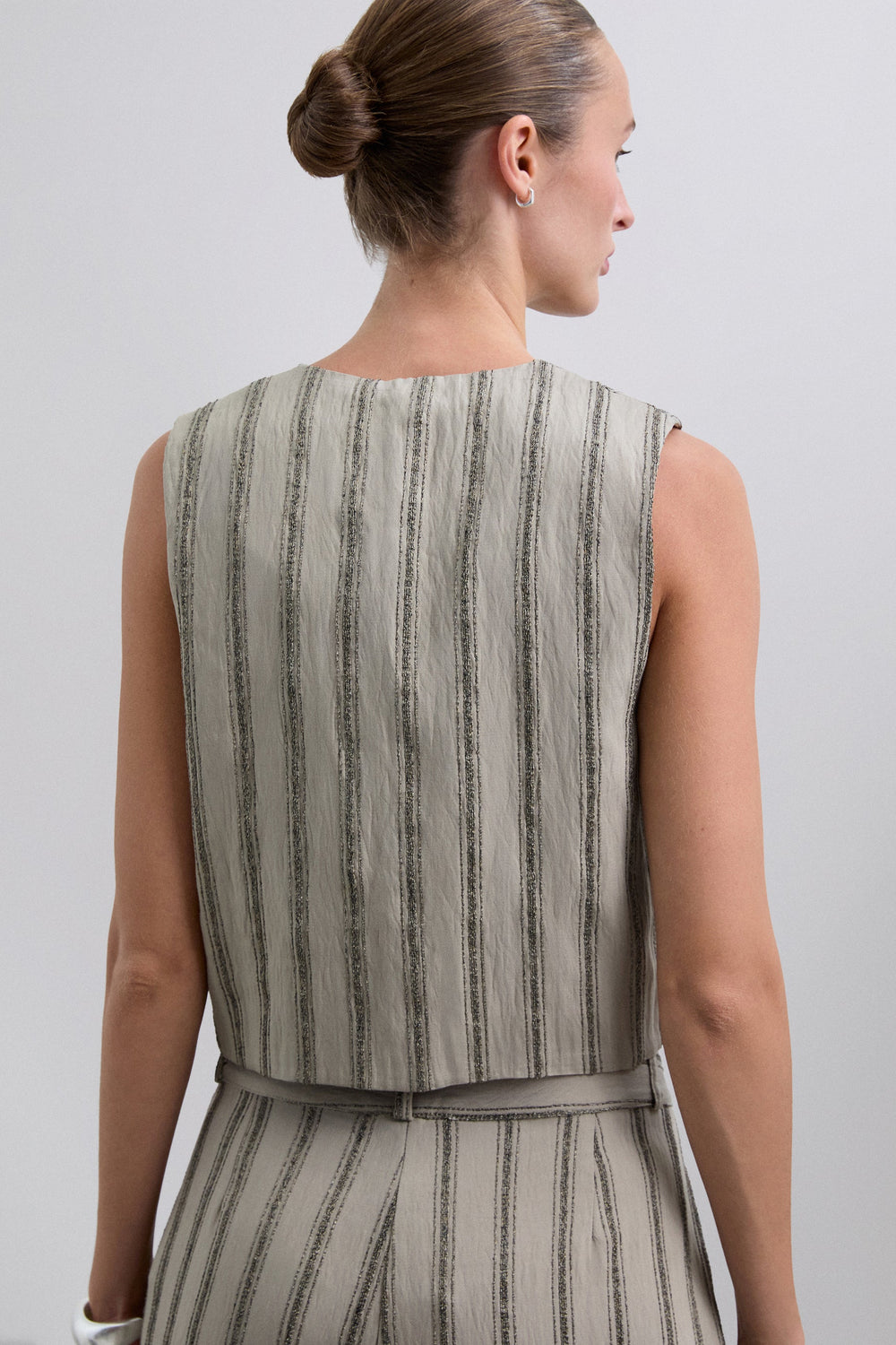 Gestreifte Weste mit Lamédetails. Aus fließendem Gewebe. Regular Fit. Knopfleiste. V-Ausschnitt. Ärmellos.