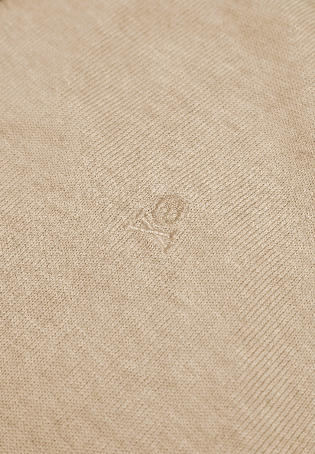 Pullover aus 100 % hochwertiger Supima-Baumwolle. V-Ausschnitt. Farblich passende Totenkopf-Stickerei auf der Brust. Enden aus Rippstoff.