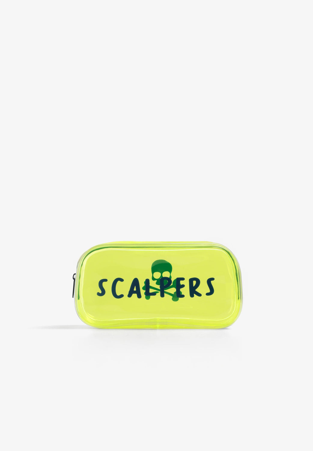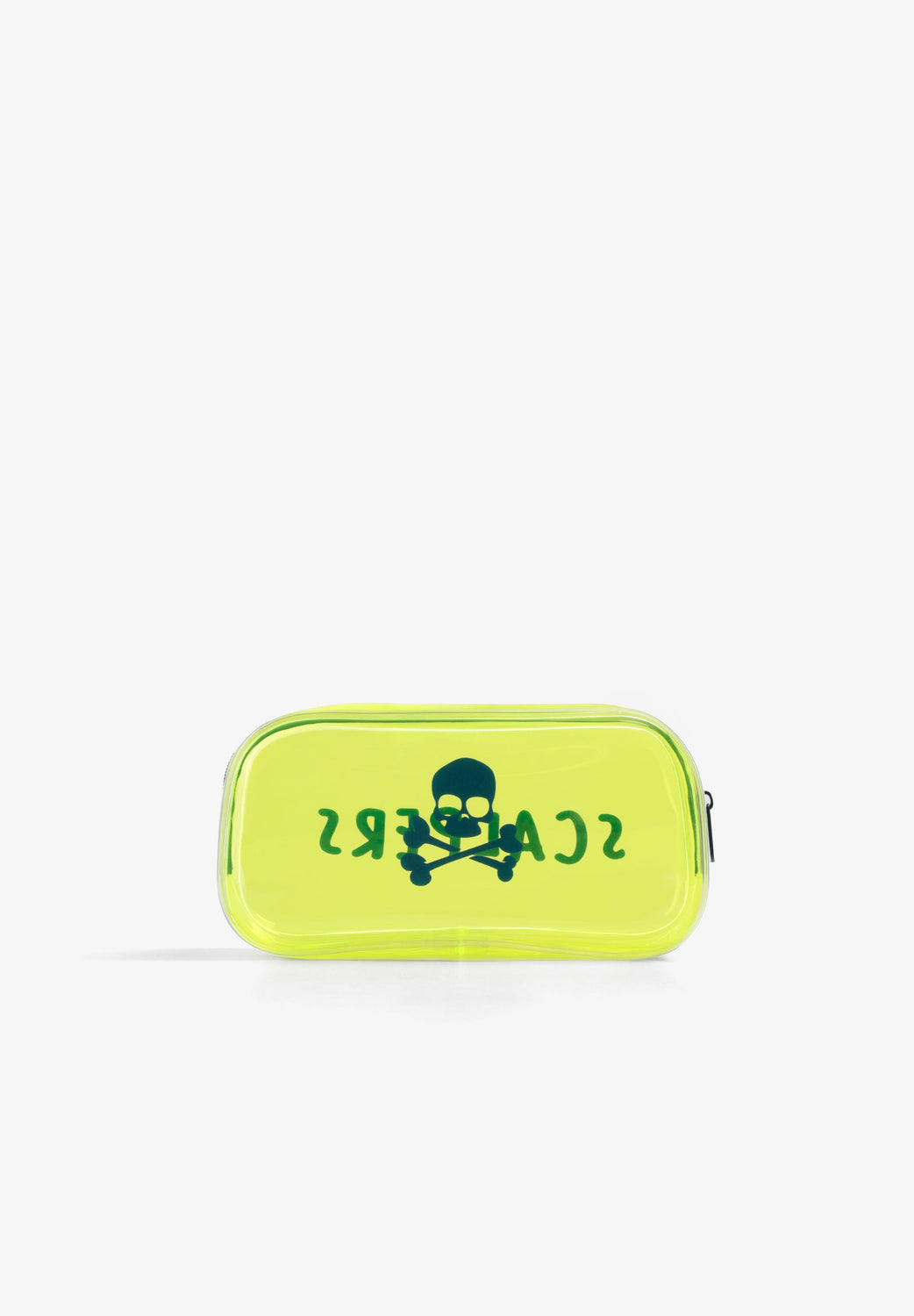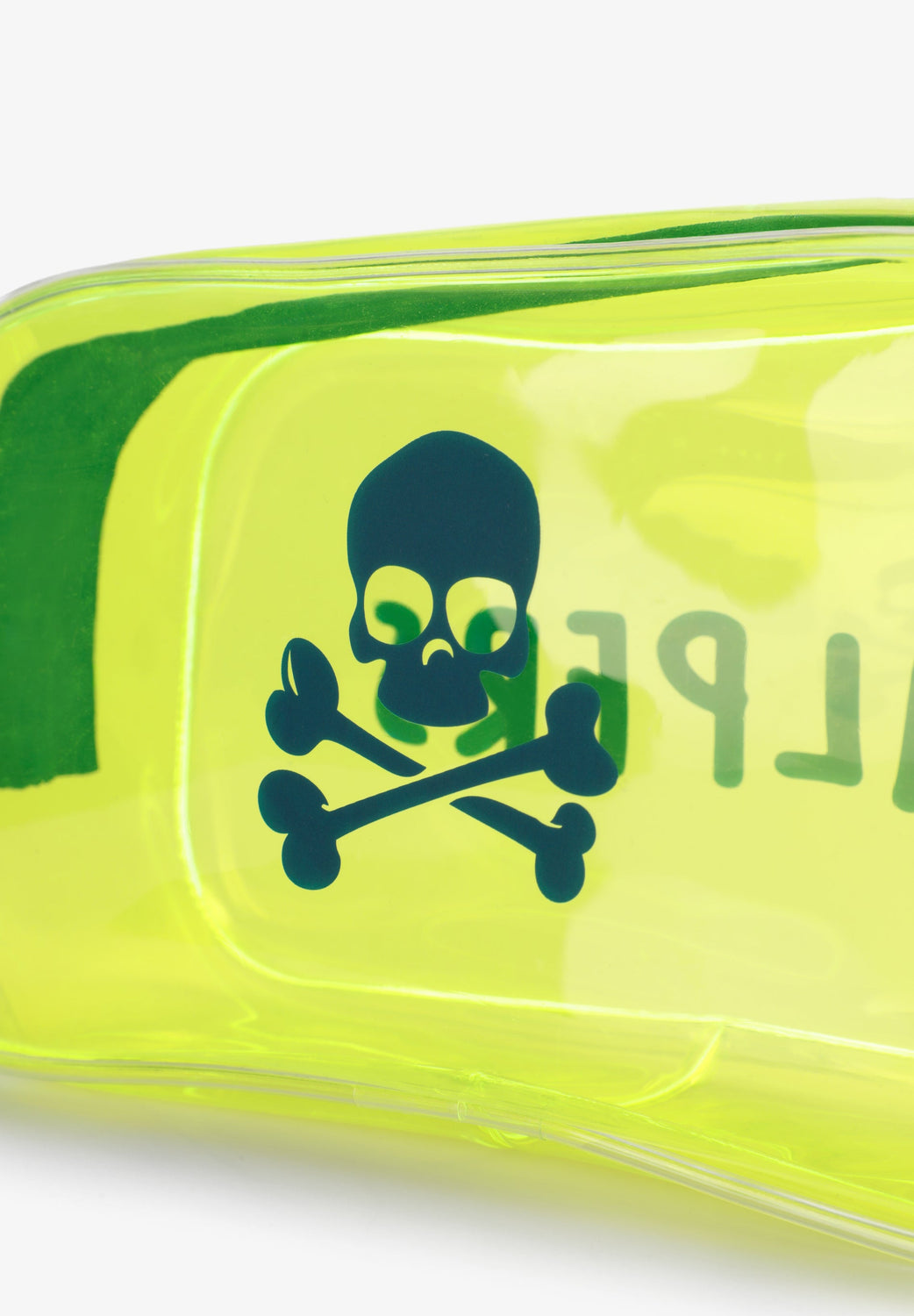 Transparentes Necessaire mit Reißverschluss. Seitlicher Print mit Totenkopf und Logo. Mit transparenten Flaschen für Flüssigkeiten.
