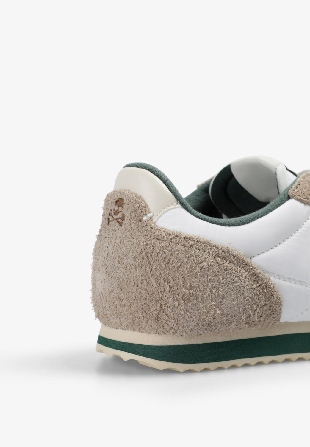 Sneaker im Retro-Stil. Seitliches Totenkopf-Detail und farblich abgesetzte, grüne Abschlüsse. Mit Schnürung und gezahnter Sohle.