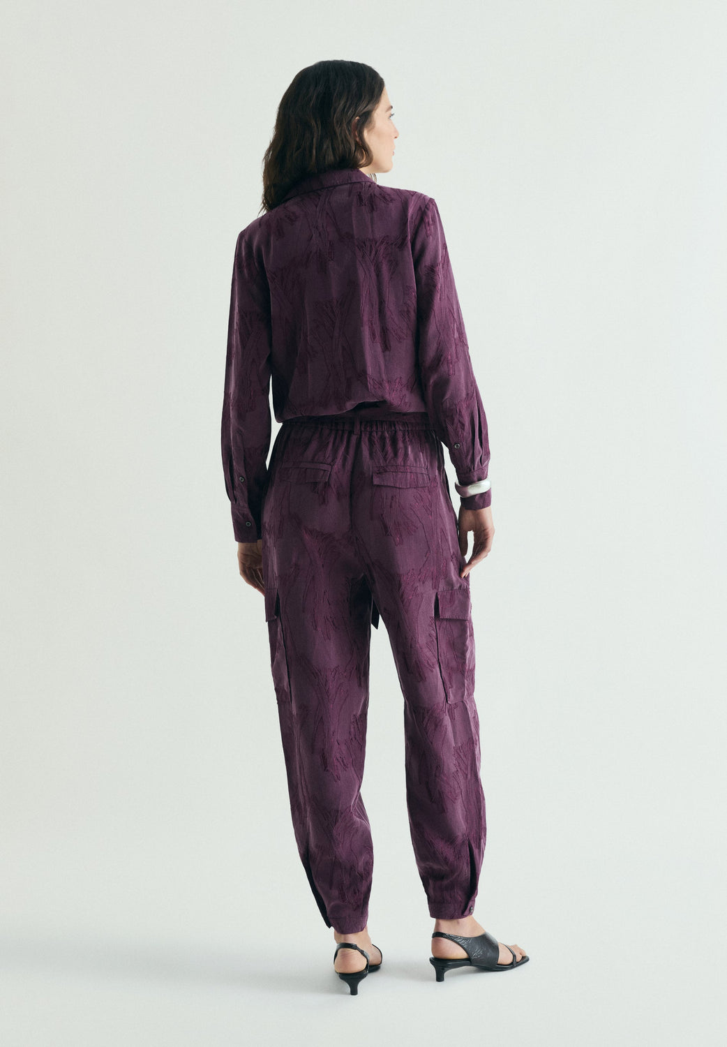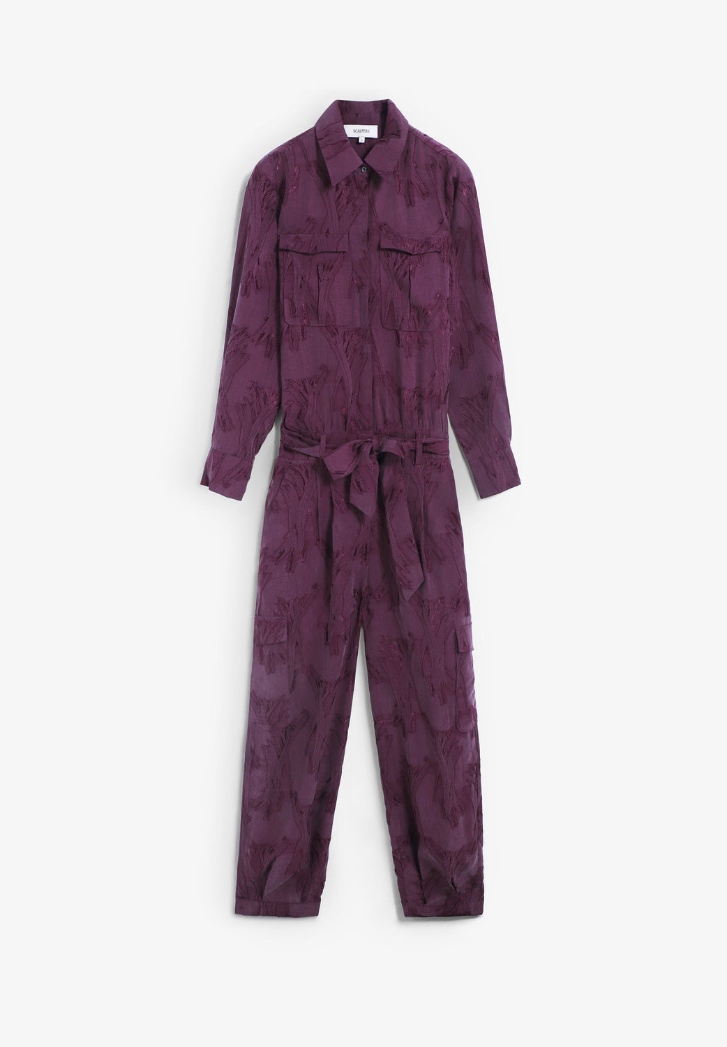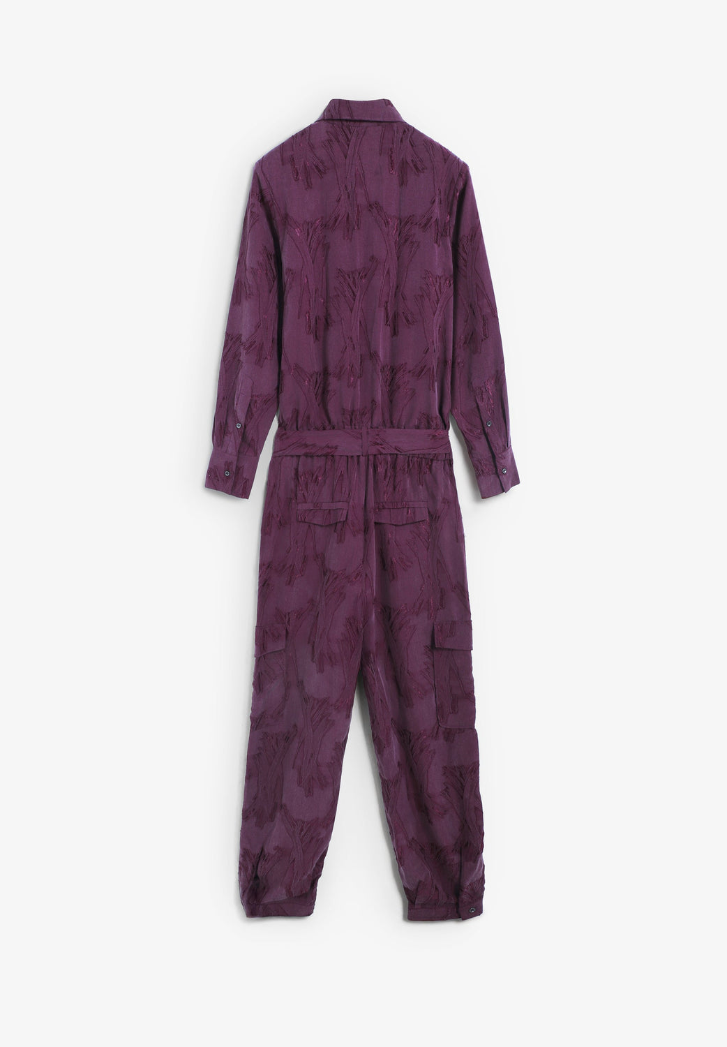 Jumpsuit aus Jacquard-Gewebe. Relaxed Fit. Hemdkleid-Kragen und lange Ärmel. Aufgenähte Klappentaschen auf der Brust Gummizugbund mit Gürtel aus dem gleichen Gewebe. Hosenbein mit Seitentaschen, am Knöchel verstellbar. Knopfverschluss vorne.