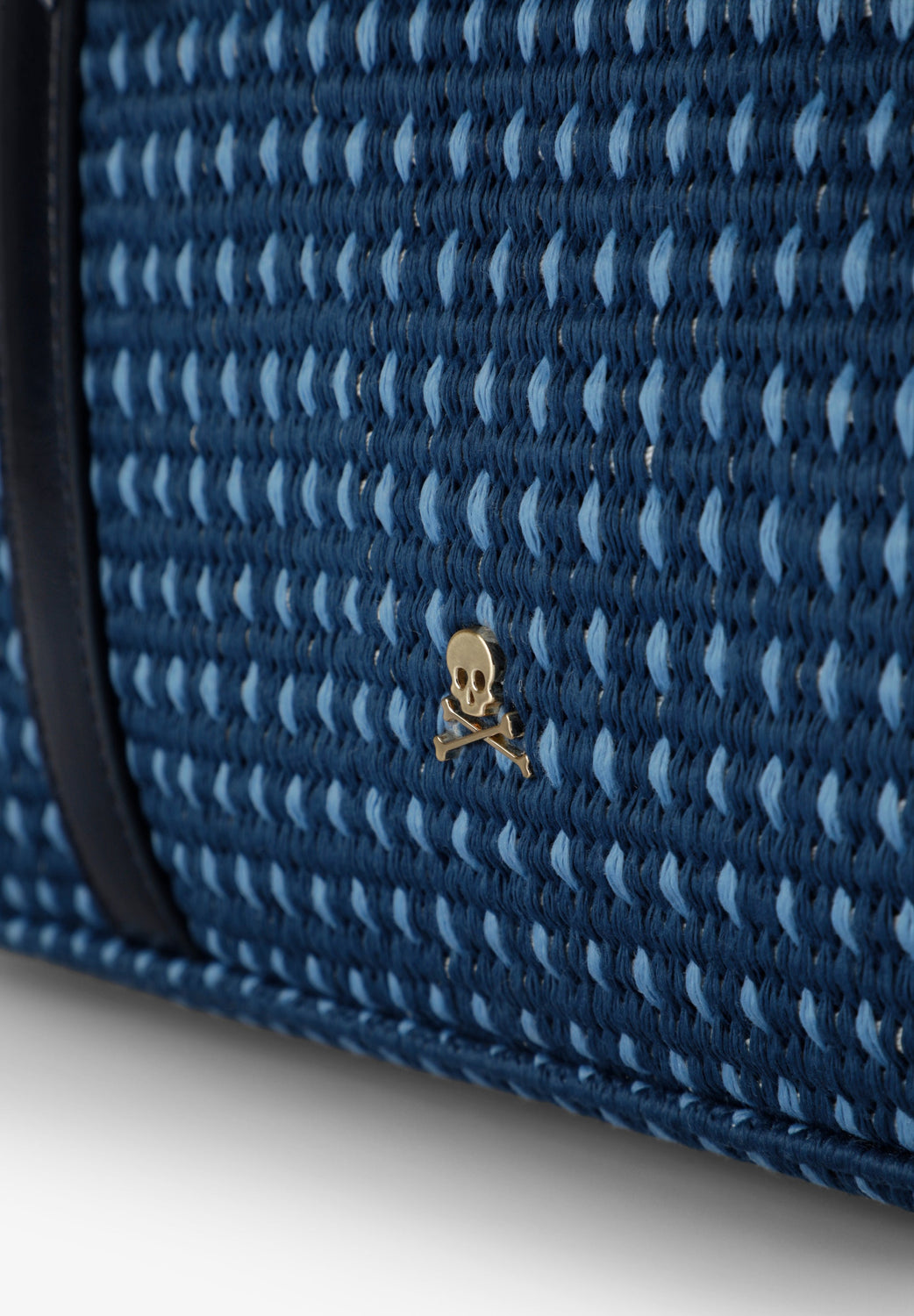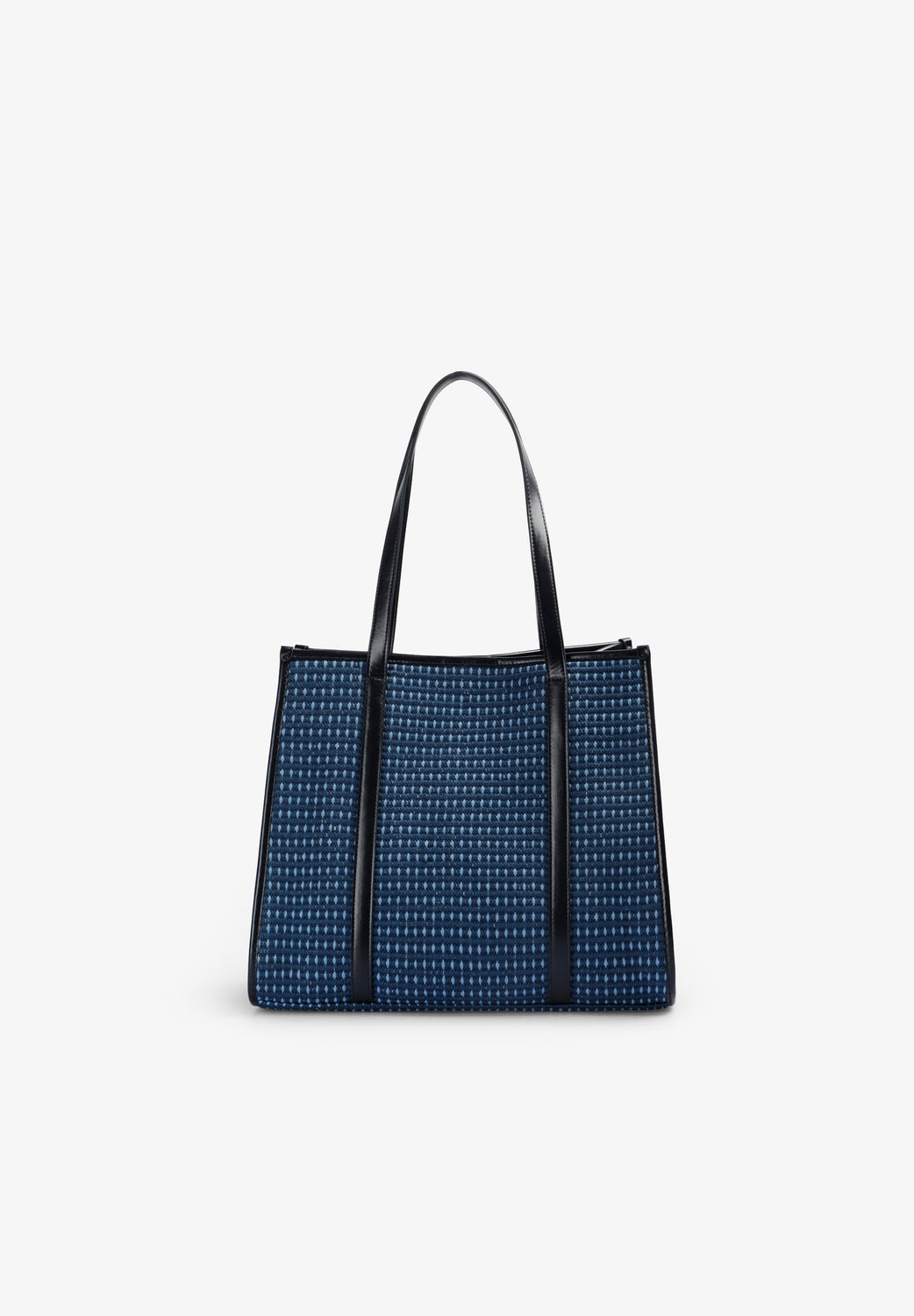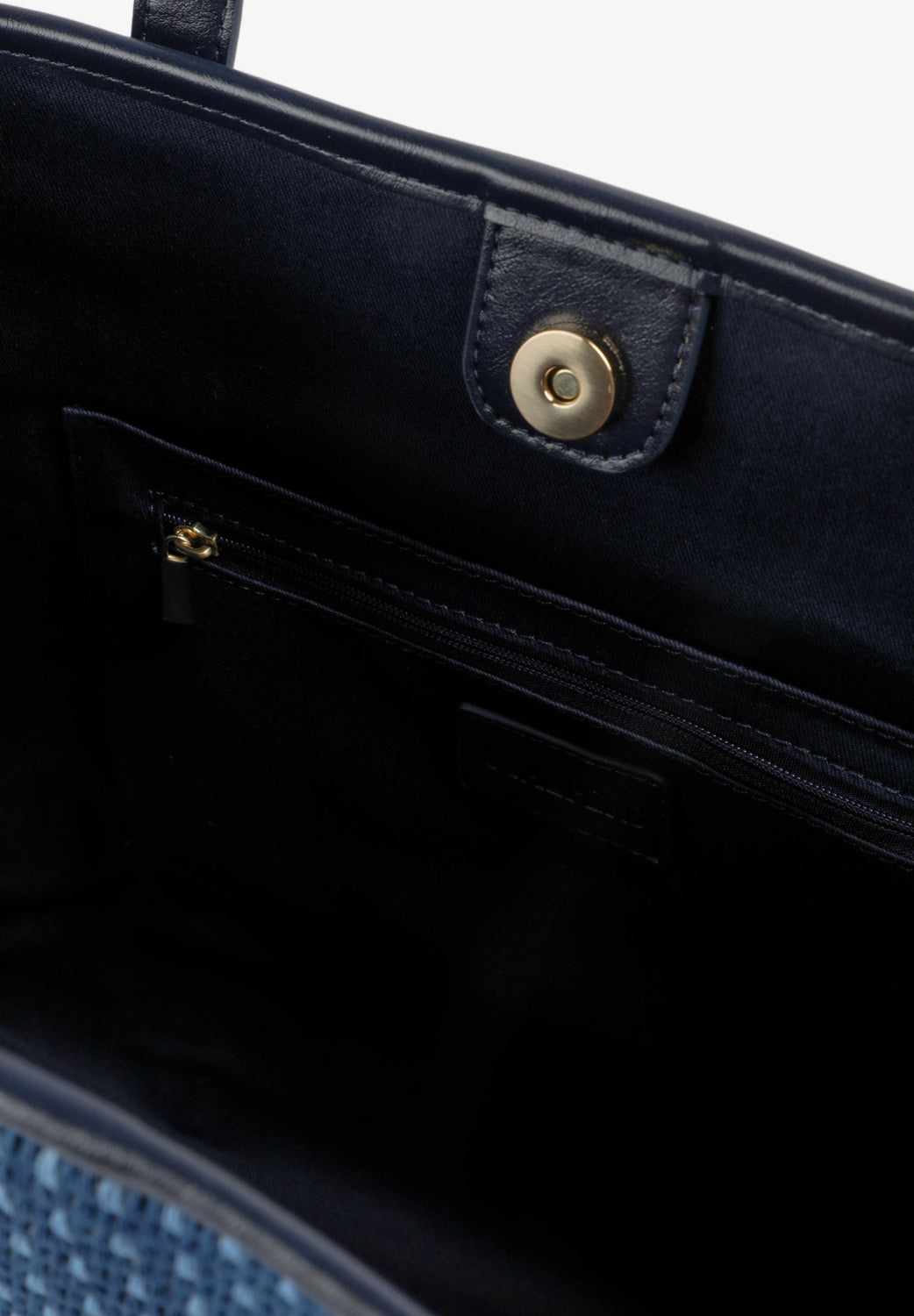 Shopper-Tasche aus geflochtenem Gewebe. Zwei Tragegurte mit dekorativer Kordel. Innenfütterung mit Reißverschlusstasche. Knopfleiste mit Magnet.