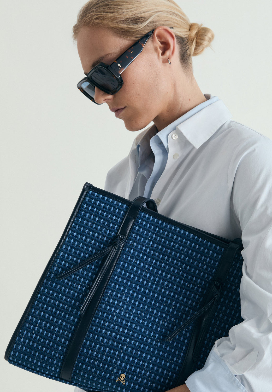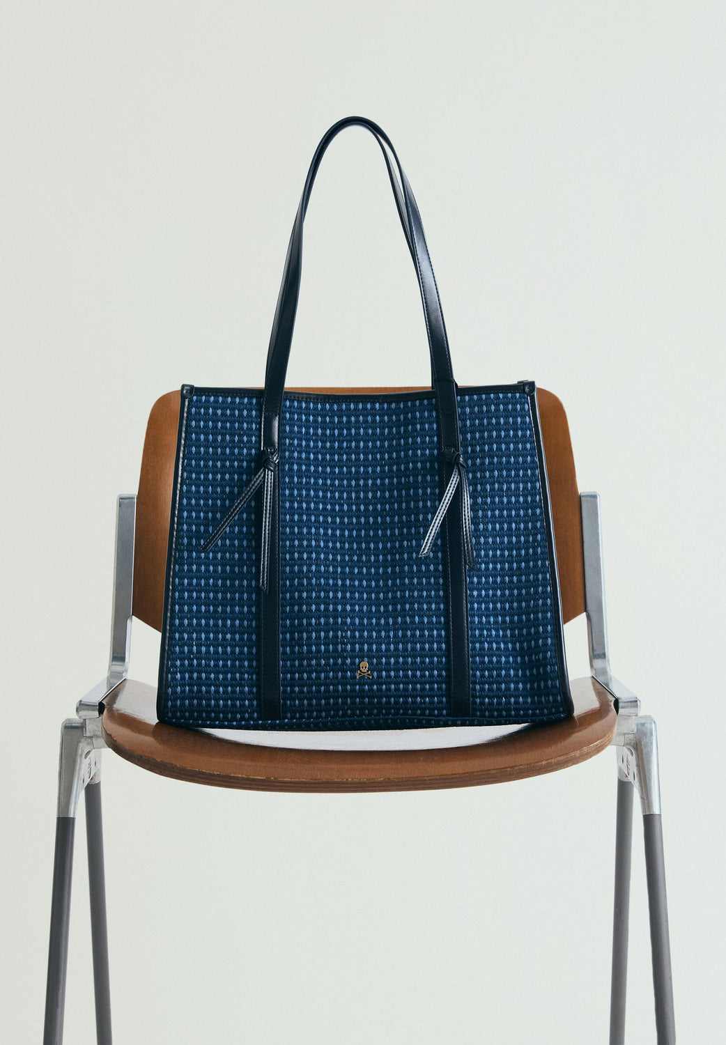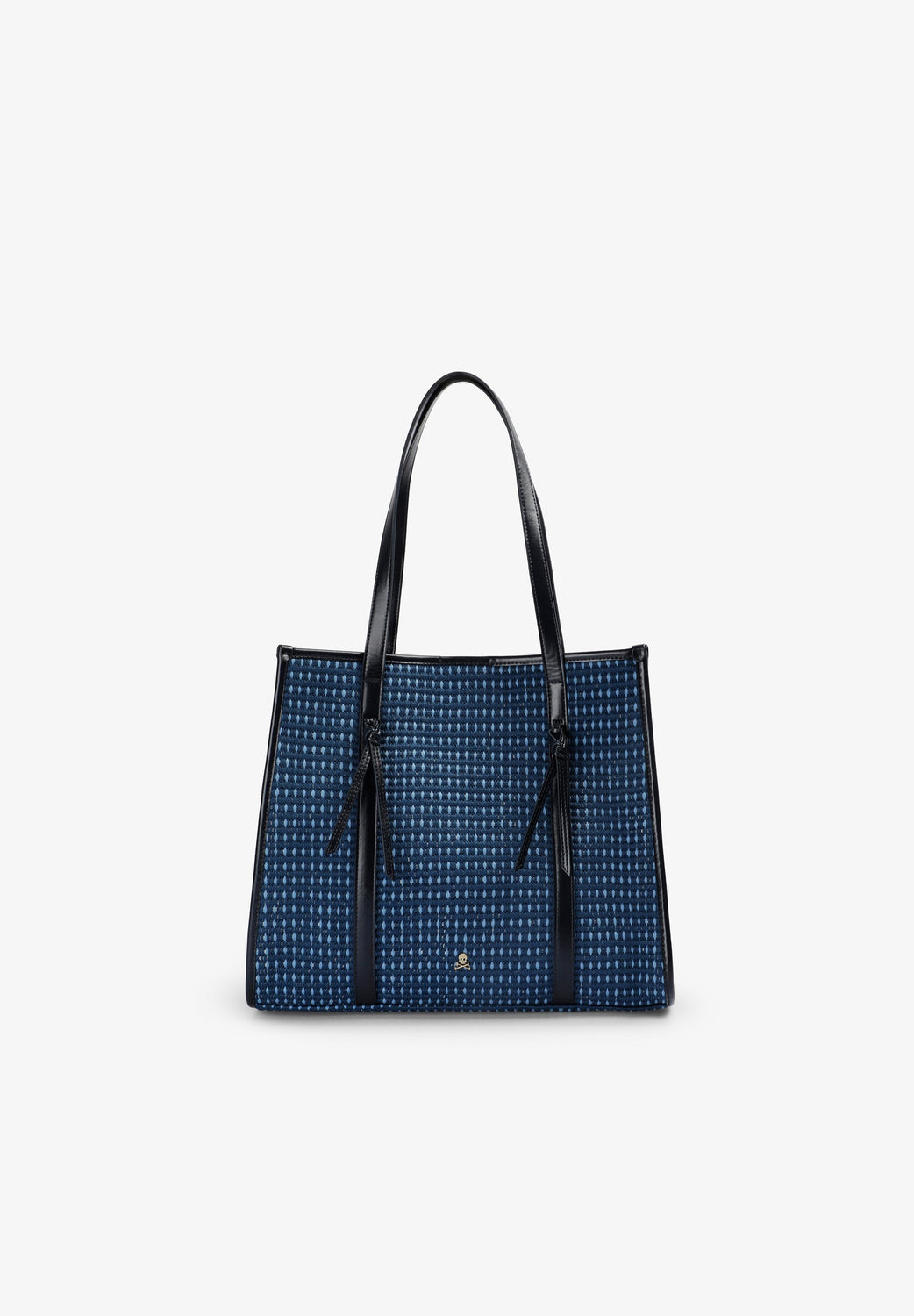 Shopper-Tasche aus geflochtenem Gewebe. Zwei Tragegurte mit dekorativer Kordel. Innenfütterung mit Reißverschlusstasche. Knopfleiste mit Magnet.
