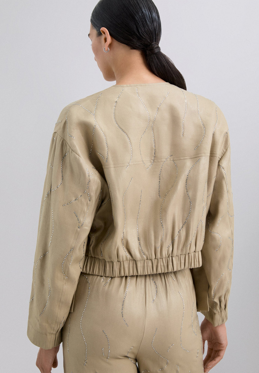 Bomberjacke mit Strasssteinen. Reißverschluss und Knöpfe vorne. Rundausschnitt Geraffte Bündchen und Saum. Fließendes Gewebe mit satiniertem Finish. Elastisches Band mit Schleifenverzierung an den Seiten.