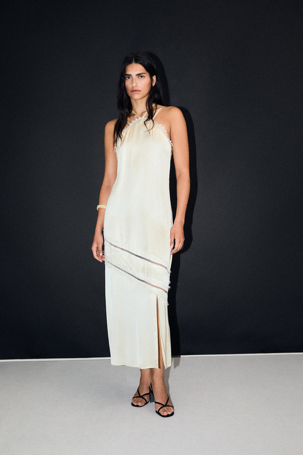 Vestido corte midi de tejido fluido y acabado satinado. Tirantes finos. Detalle de encaje en escote. Motivos asimétricos. Apertura en bajo.
