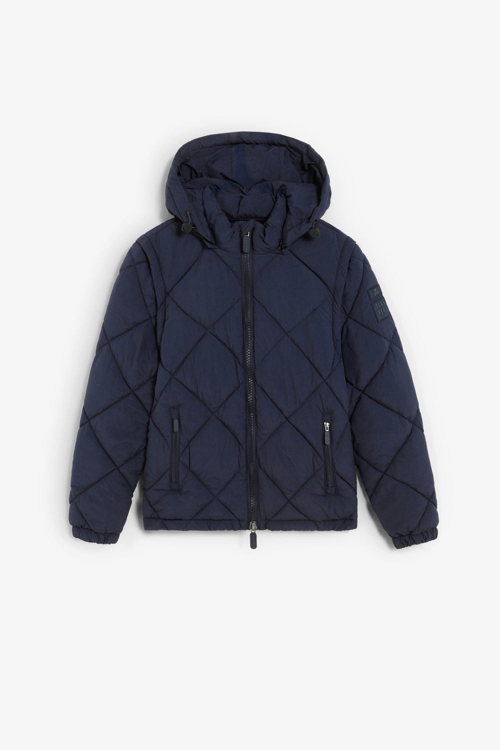 Jacke mit Kapuze und abnehmbaren langen Ärmeln. Reißverschluss. Gummiertes Logo auf dem Ärmel. Vordertasche. Logo am Ausschnitt.