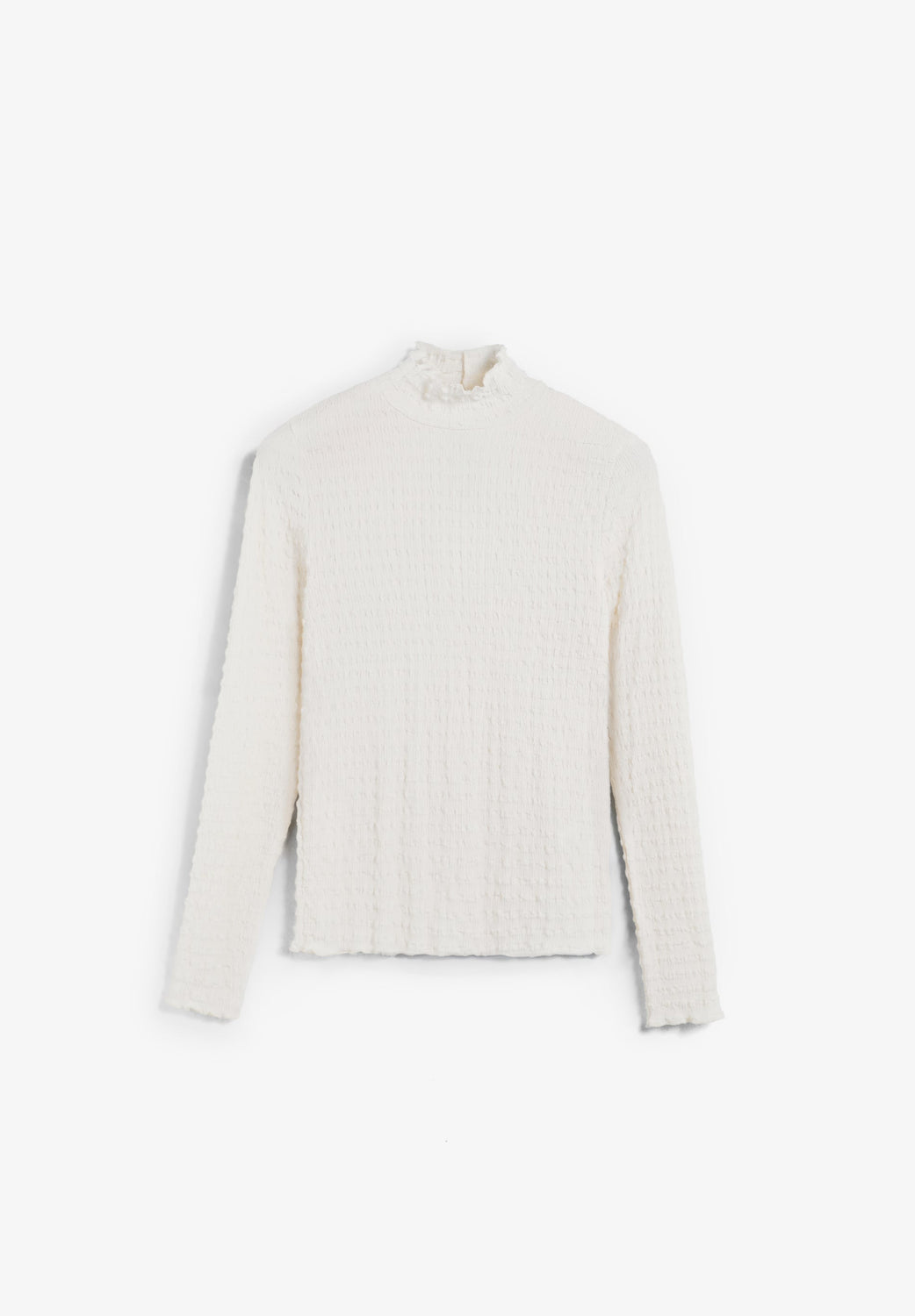 Oberteil mit Rollkragen und langen Ärmeln. Leichtes Gewebe mit Struktur mit Raffung.