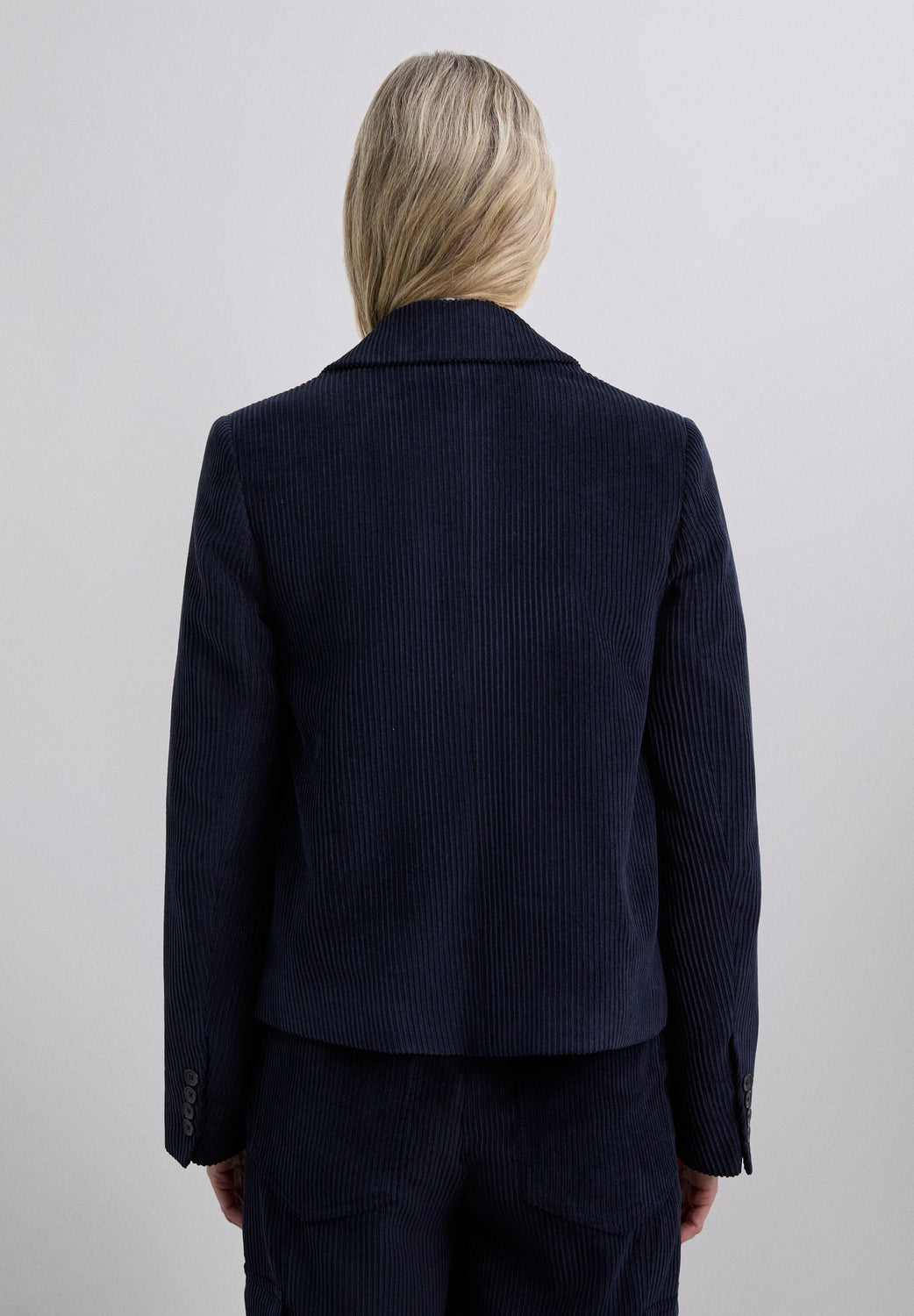 Blazer aus Cord mit fallendem Revers. Lange Ärmel. Zweireihiger Knopfverschluss vorne. Zwei Pattentaschen vorne. Knopfverschluss an den Bündchen.