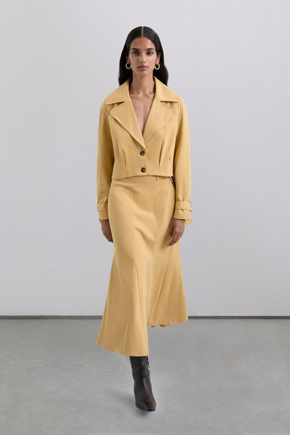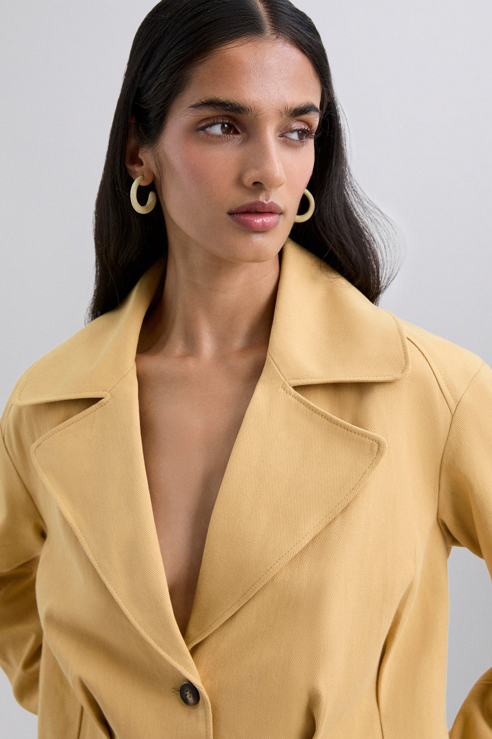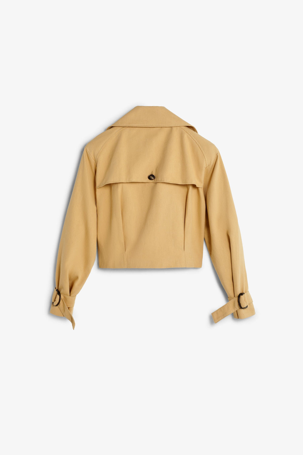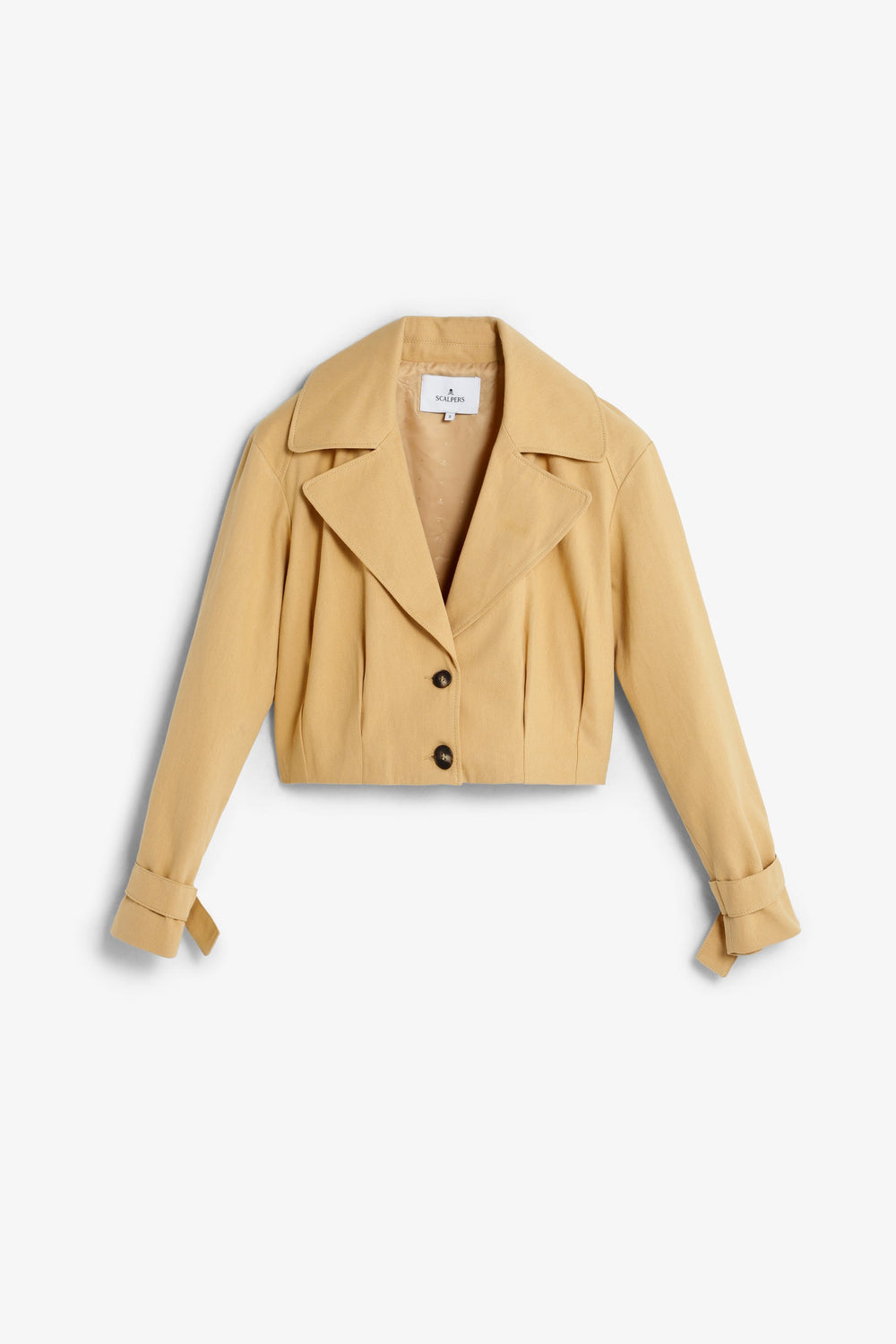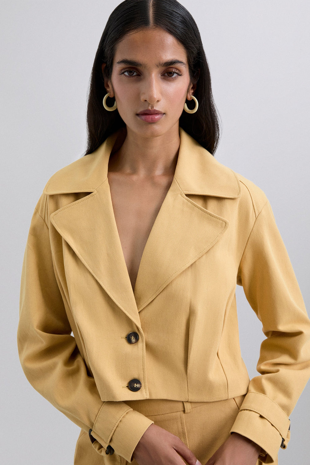 Leichte Cropped-Jacke aus 100 % Baumwolle mit Spitzenrevers und Knopfverschluss vorne. Lange Ärmel mit geknöpften Manschetten