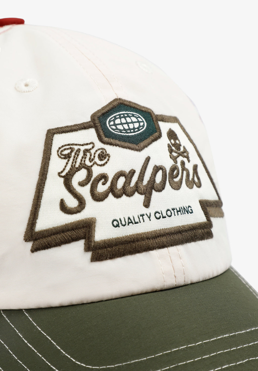 Dreifarbige Kappe aus Nylon. Verstellbarer Verschluss hinten und Stickerei mit Logo und farblich abgesetztem Totenkopf vorne. Logo-Etikett auf der Rückseite.