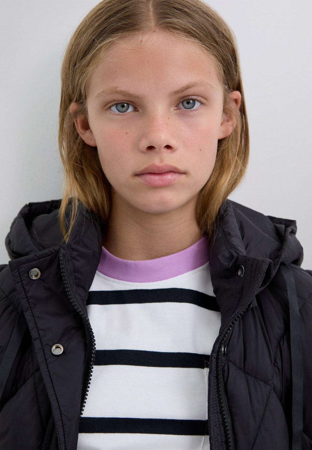 Steppmantel. Abnehmbare Kapuze und Ärmel. Verdeckter Reißverschluss vorne durch Patte mit Druckknopfverschluss. Mit Seitentaschen. Recycling-Innenfütterung. Logo auf der Rückseite.