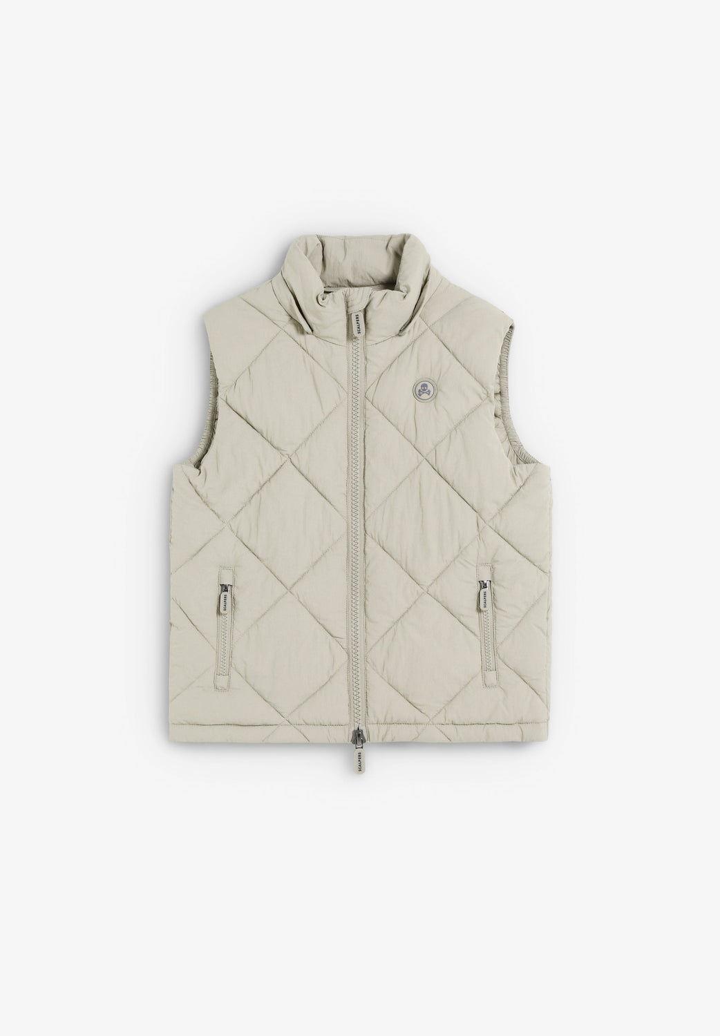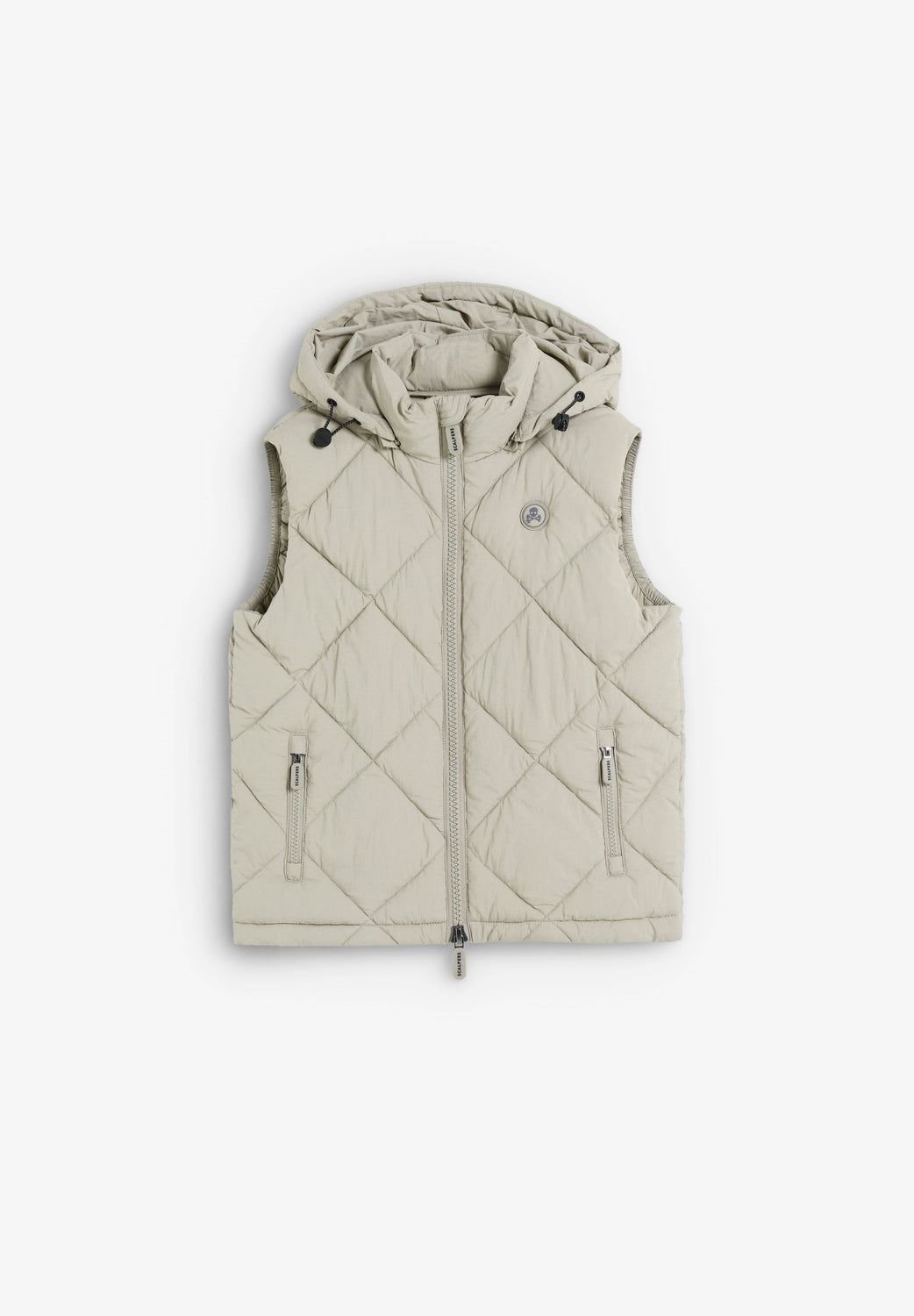 Robuste Steppweste mit verstellbarer Kapuze. Doppelreißverschluss. Gummierter Totenkopf auf der Brust. Taschen mit Reißverschluss und Innentasche.