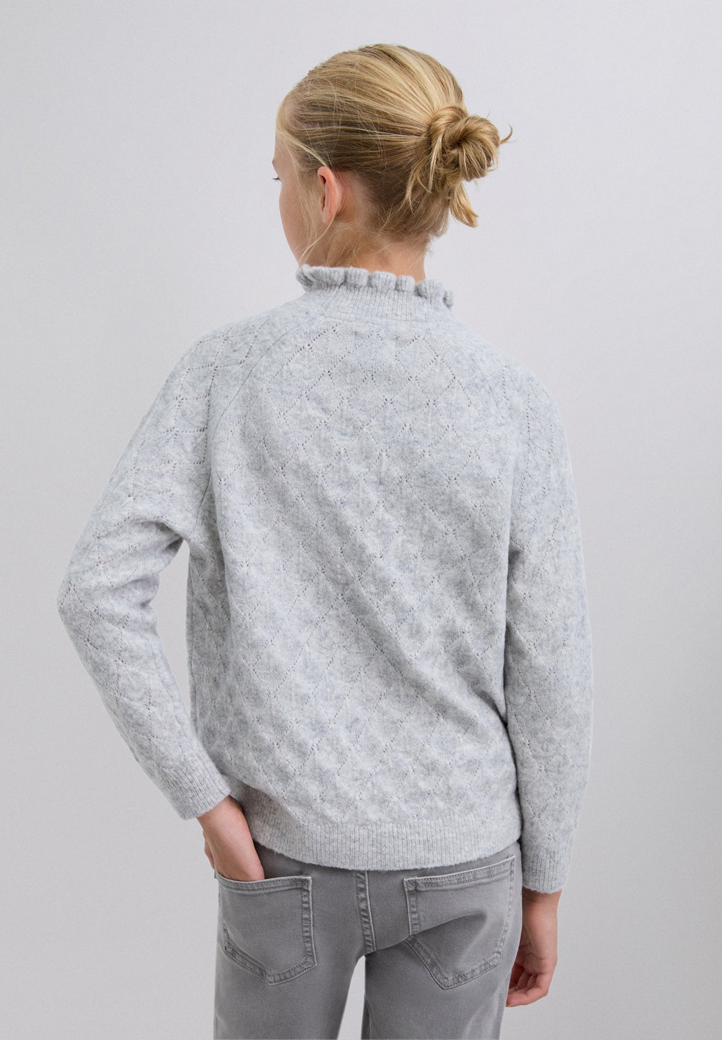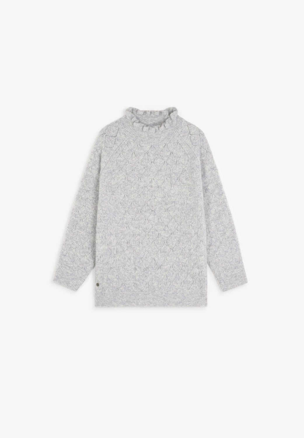 Strickpullover mit Merinowolle. Gerippter Stehkragen mit Volants. Lange Ärmel mit Rippstoff-Saum. Lochmuster-Motiv mit Rautenmuster.