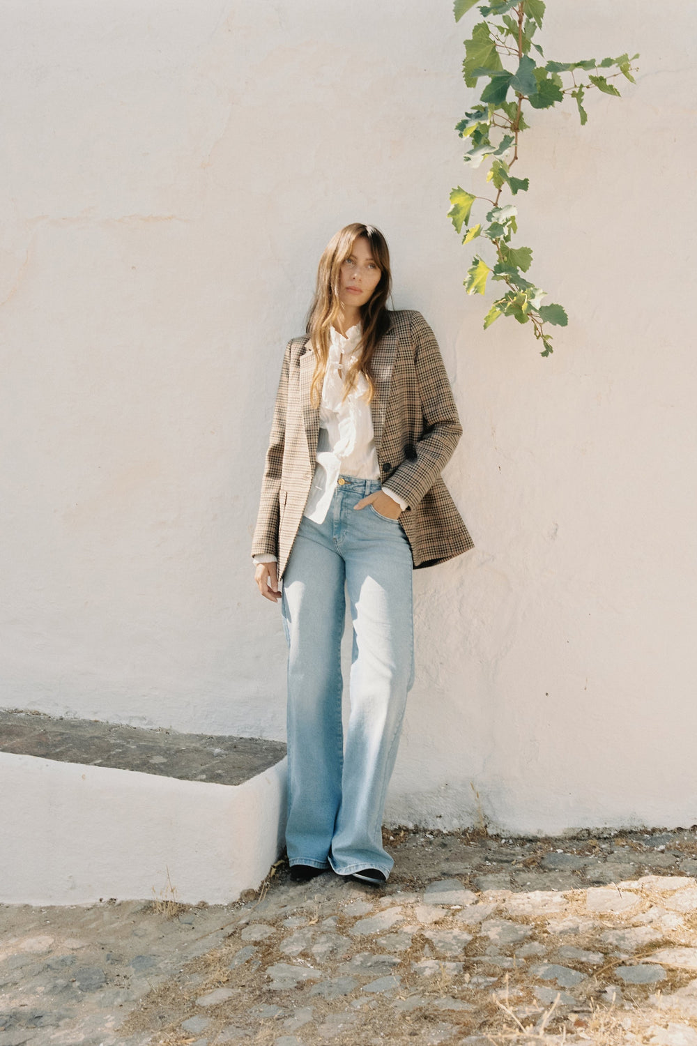 Mid-rise jeans with belt loops. Full length, front zip and button fastening. Back and front pockets.