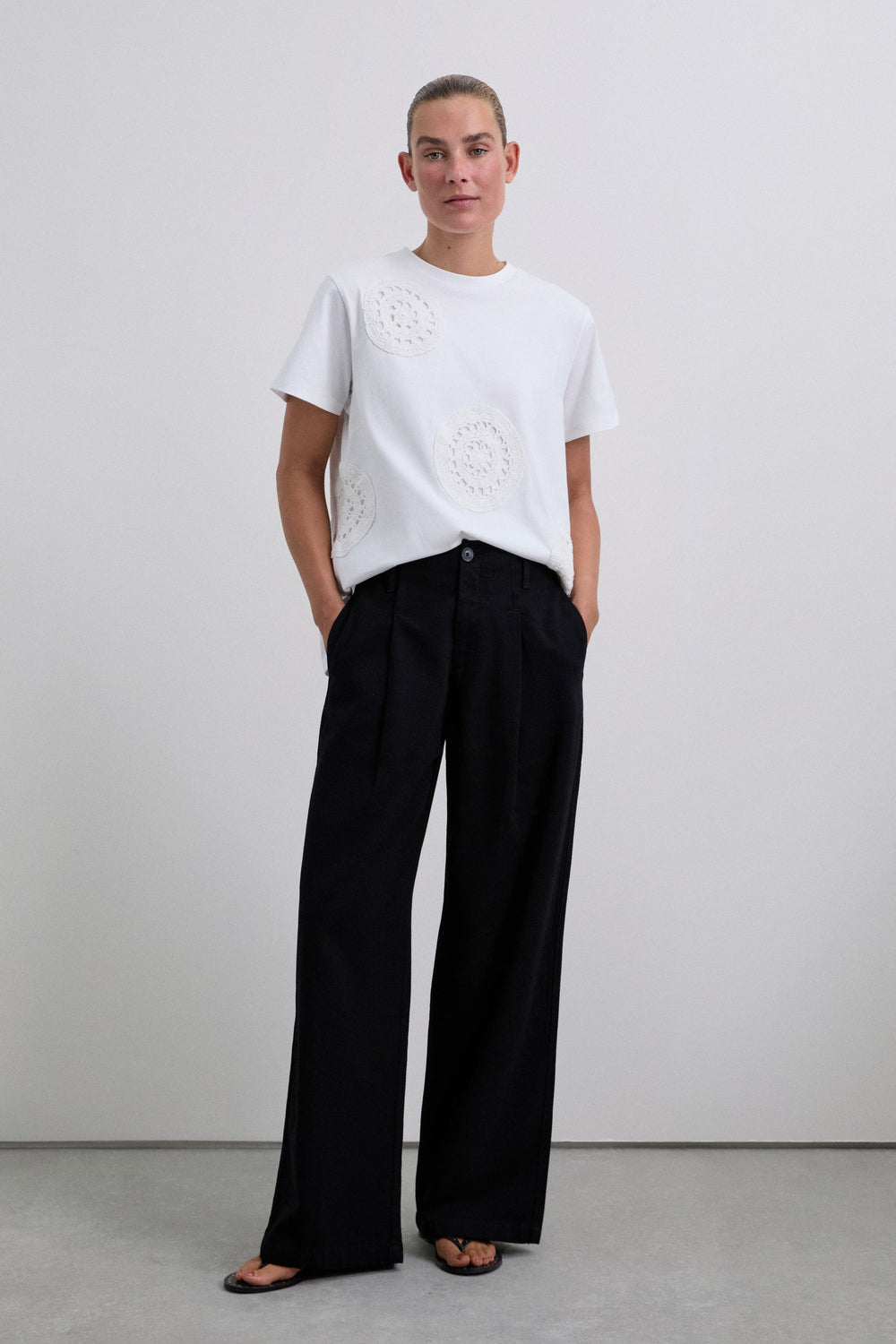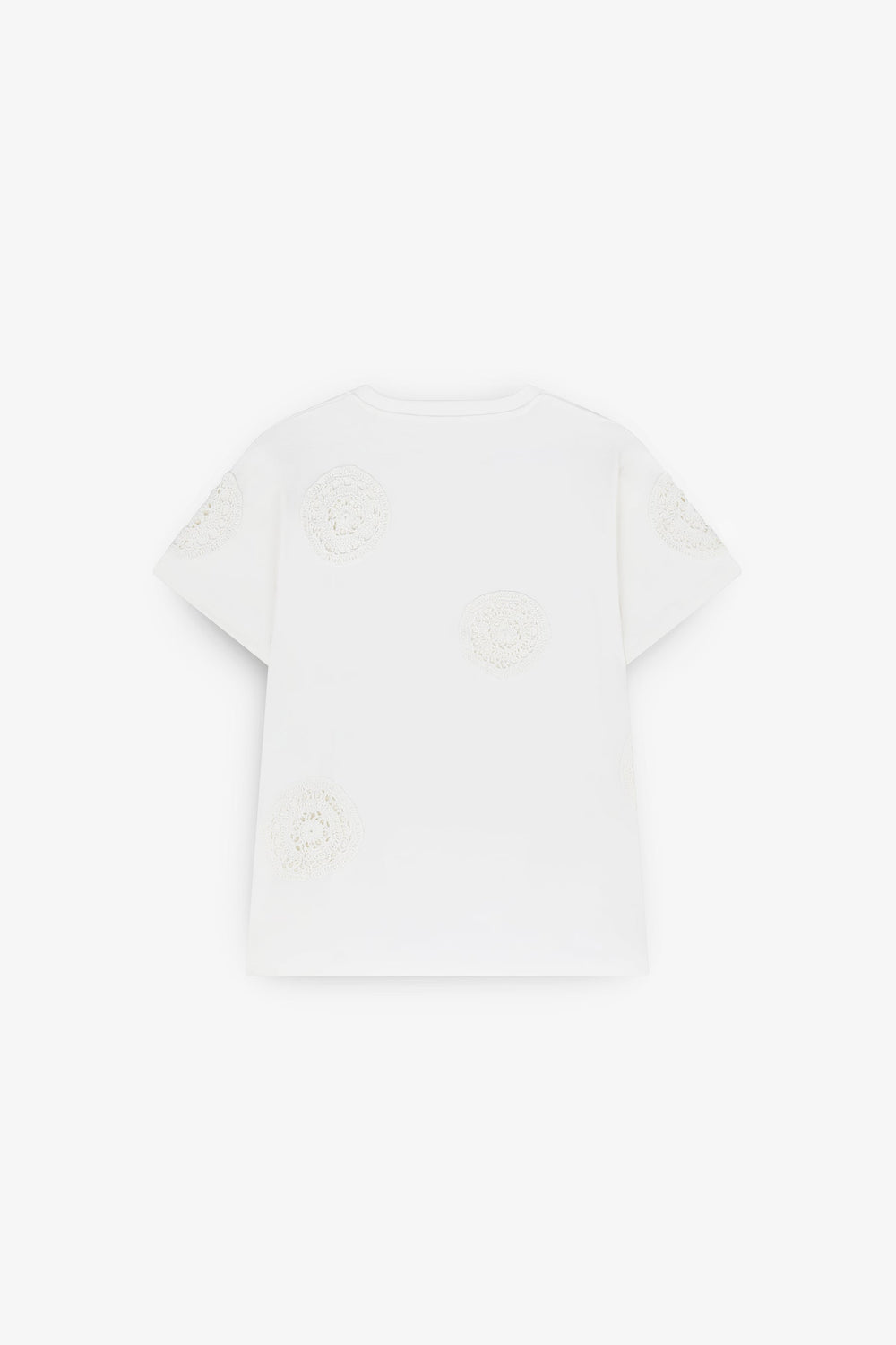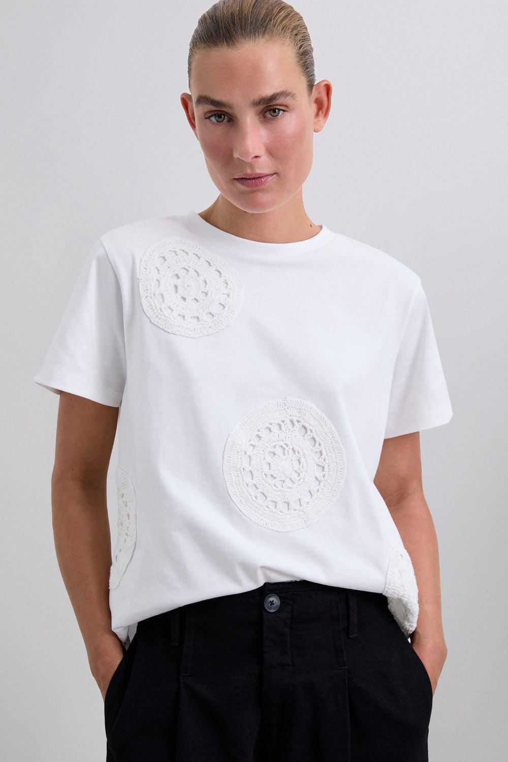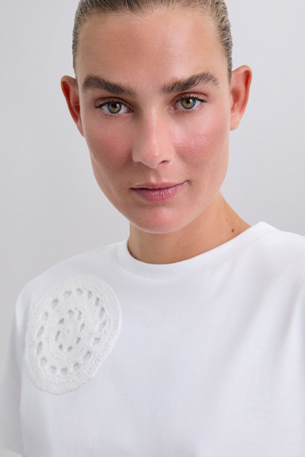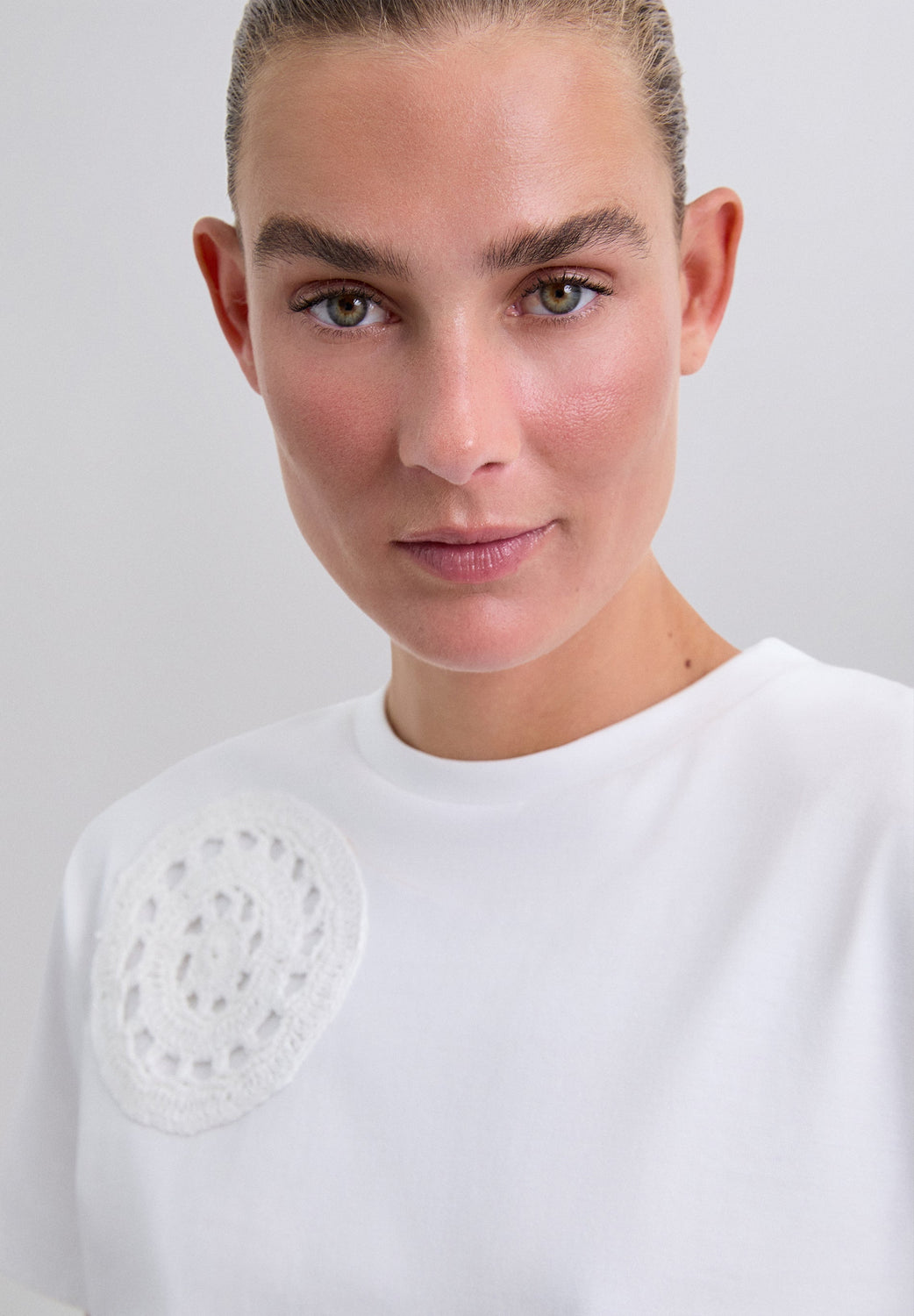 T-Shirt aus 100 % BCI-Baumwolle. Häkelspitze-Motive auf Brust und Rücken. Regular Fit, Rundausschnitt und kurze Ärmel.