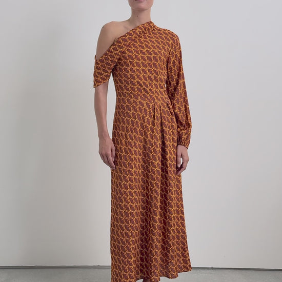 Kleid mit Print, langen Ärmeln und kurzen Puffärmeln mit elastischen Bündchen. Asymmetrischer Ausschnitt. Mit einer freien Schulter. Slim Fit