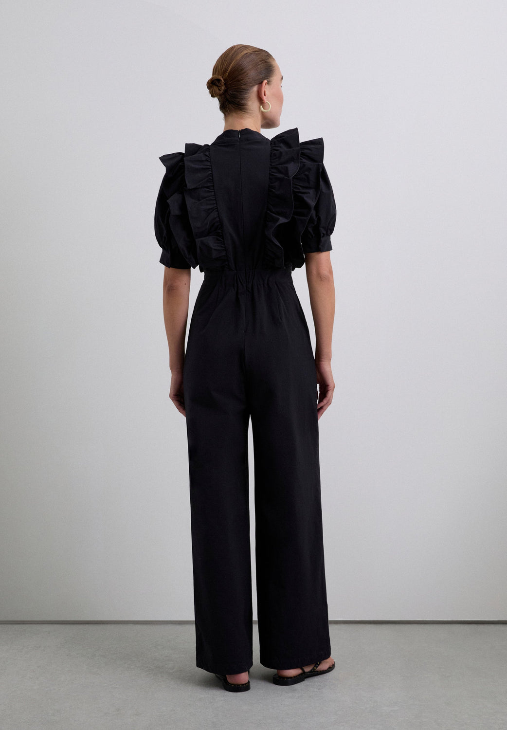 SCHWARZER JUMPSUIT MIT VOLANTS