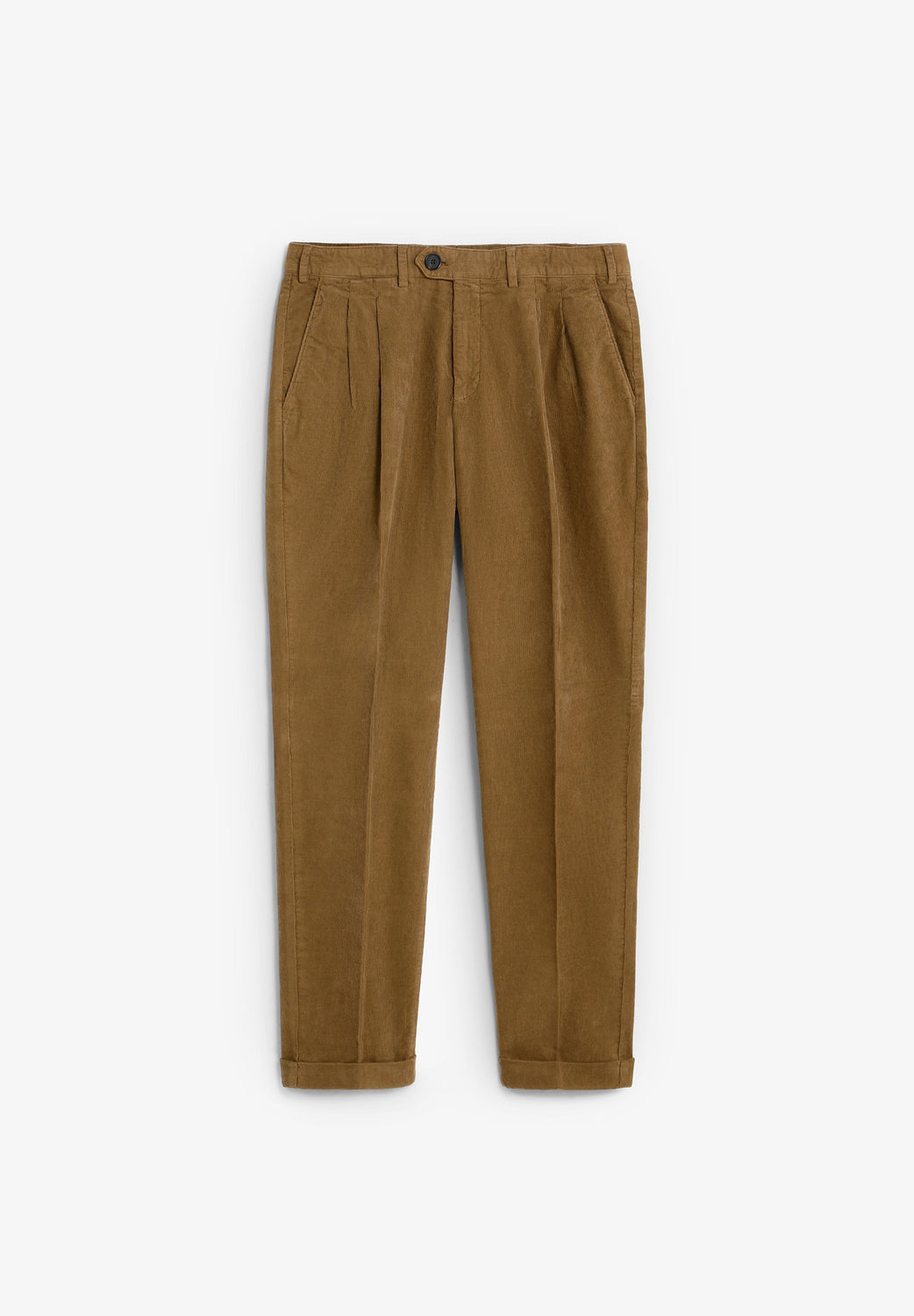 Chinohose aus Cord. Loose Fit mit Bundfalten. Verdeckter Reißverschluss und verlängerter Knopf am Bund. Seitentaschen und Gesäßtaschen.